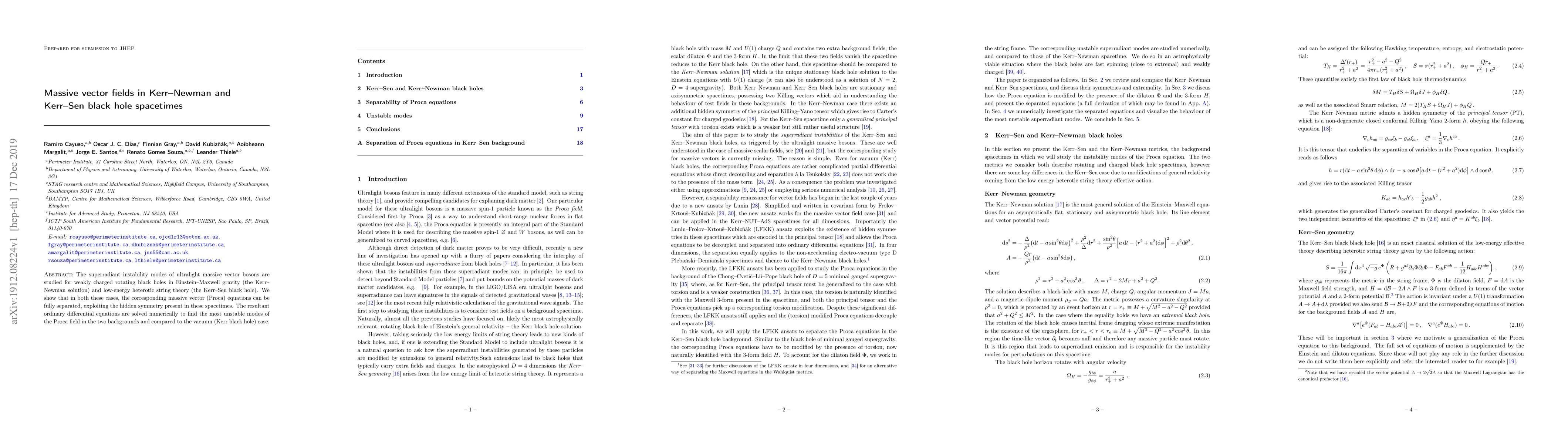 The superradiant instability modes of ultralight massive vector bosons are studied for weakly charged rotating black holes in Einstein--Maxwell gravity (the Kerr--Newman solution) and low-energy heterotic string theory (the Kerr--Sen black hole). We show that in both these cases, the corresponding massive vector (Proca) equations can be fully separated, exploiting the hidden symmetry present in these spacetimes. The resultant ordinary differential equations are solved numerically to find the most unstable modes of the Proca field in the two backgrounds and compared to the vacuum (Kerr black hole) case.