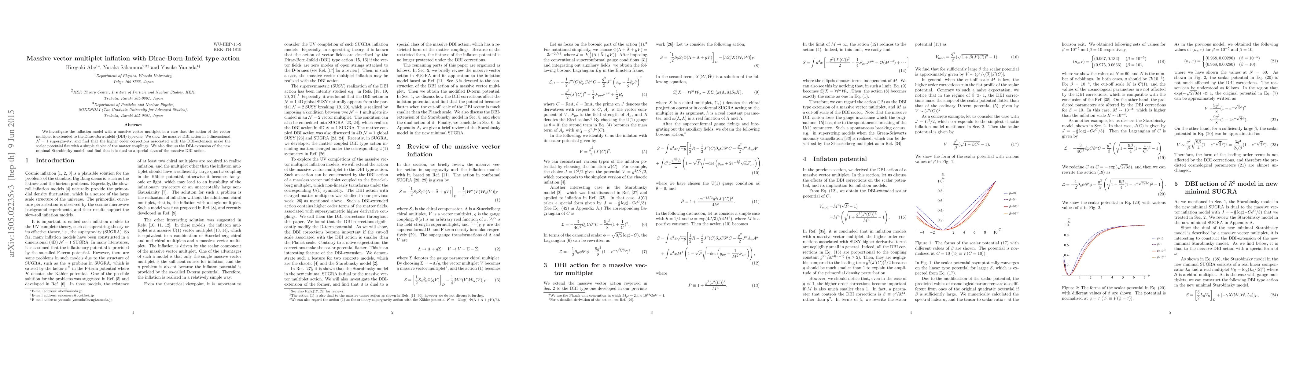 This paper explores inflation driven by a massive vector multiplet with a Dirac-Born-Infeld (DBI) type action in 4-dimensional ${\cal N}=1$ supergravity, demonstrating that higher-order corrections flatten the scalar potential. It also examines the DBI-extended new minimal Starobinsky model, revealing its duality to a specific type of massive DBI action.