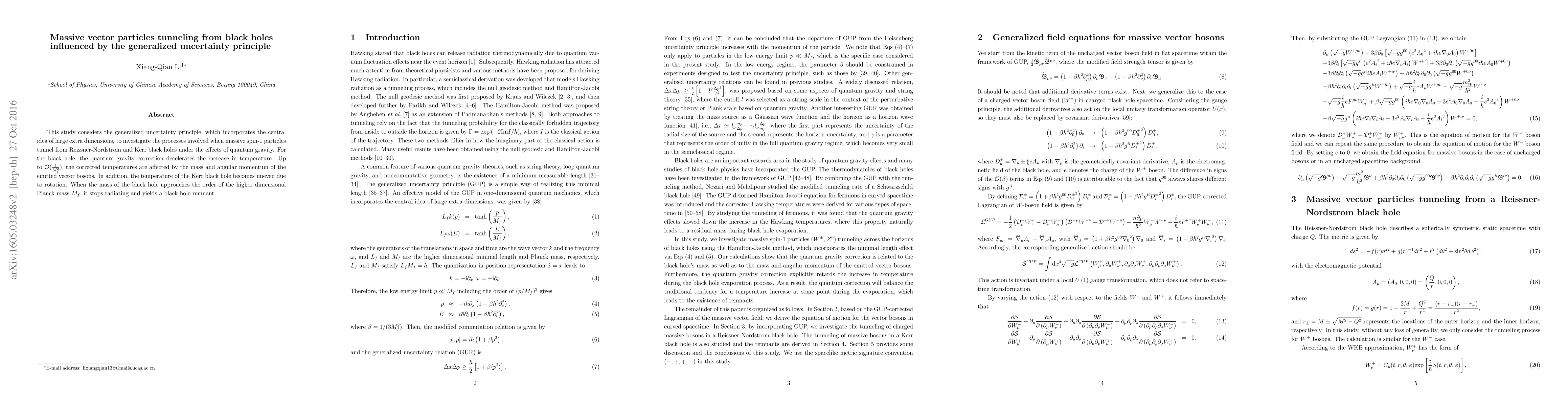 This study considers the generalized uncertainty principle, which incorporates the central idea of large extra dimensions, to investigate the processes involved when massive spin-1 particles tunnel from Reissner-Nordstrom and Kerr black holes under the effects of quantum gravity. For the black hole, the quantum gravity correction decelerates the increase in temperature. Up to $\mathcal{O}(\frac{1}{M_f^2})$, the corrected temperatures are affected by the mass and angular momentum of the emitted vector bosons. In addition, the temperature of the Kerr black hole becomes uneven due to rotation. When the mass of the black hole approaches the order of the higher dimensional Planck mass $M_f$, it stops radiating and yields a black hole remnant.
