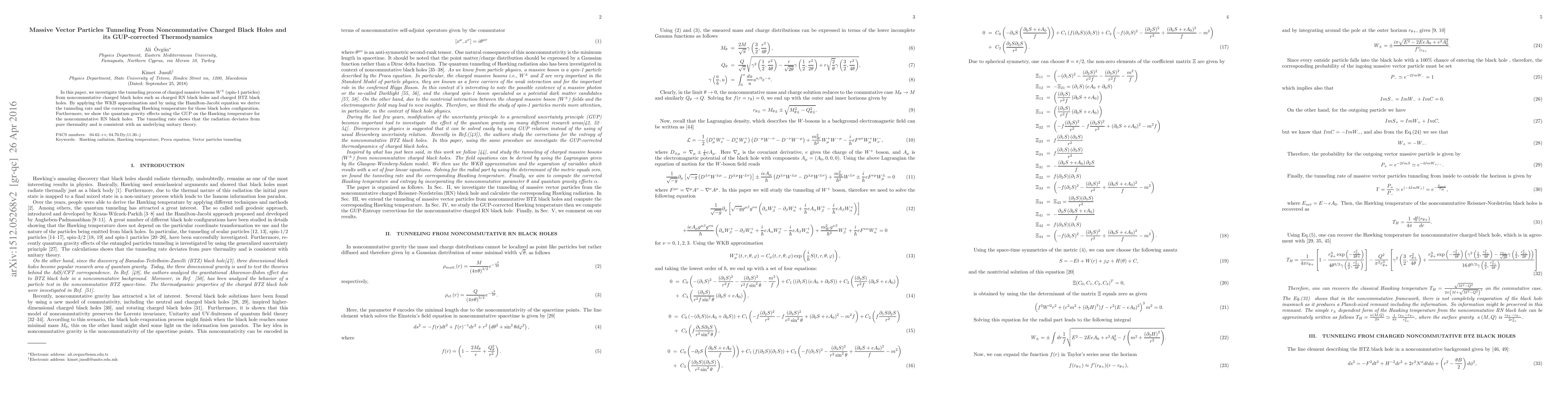In this paper, we investigate the tunneling process of charged massive bosons $W^{\pm }$ (spin-1 particles) from noncommutative charged black holes such as charged RN black holes and charged BTZ black holes. By applying the WKB approximation and by using the Hamilton-Jacobi equation we derive the tunneling rate and the corresponding Hawking temperature for those black holes configuration. Furthermore, we show the quantum gravity effects using the GUP on the Hawking temperature for the noncommutative RN black holes. The tunneling rate shows that the radiation deviates from pure thermality and is consistent with an underlying unitary theory.