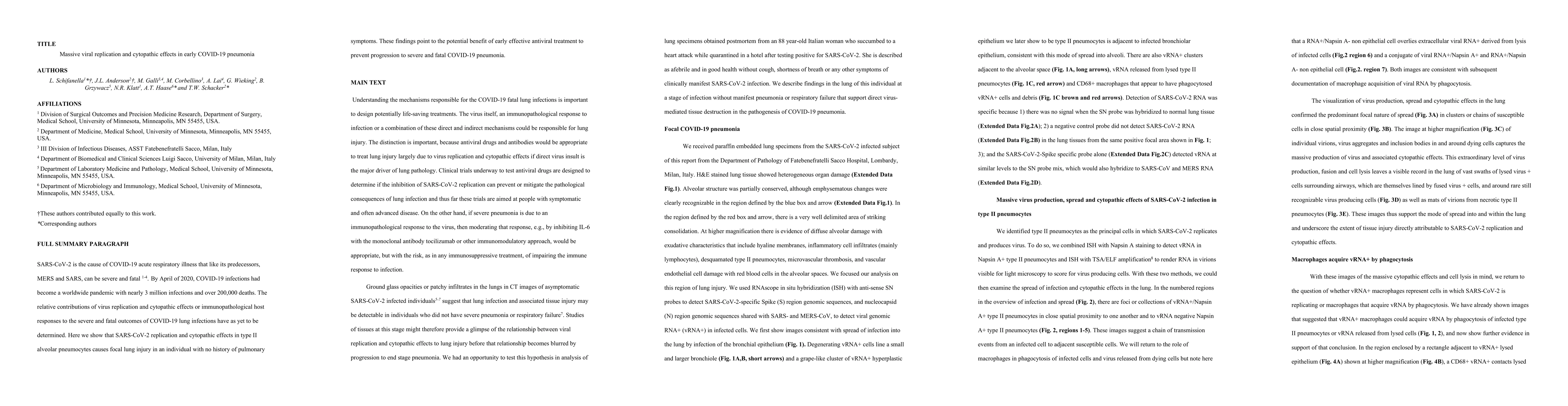 SARS-CoV-2 is the cause of COVID-19 acute respiratory illness that like its predecessors, MERS and SARS, can be severe and fatal 1-4. By April of 2020, COVID-19 infections had become a worldwide pandemic with nearly 3 million infections and over 200,000 deaths. The relative contributions of virus replication and cytopathic effects or immunopathological host responses to the severe and fatal outcomes of COVID-19 lung infections have as yet to be determined. Here we show that SARS-CoV-2 replication and cytopathic effects in type II alveolar pneumocytes causes focal lung injury in an individual with no history of pulmonary symptoms. These findings point to the potential benefit of early effective antiviral treatment to prevent progression to severe and fatal COVID-19 pneumonia.