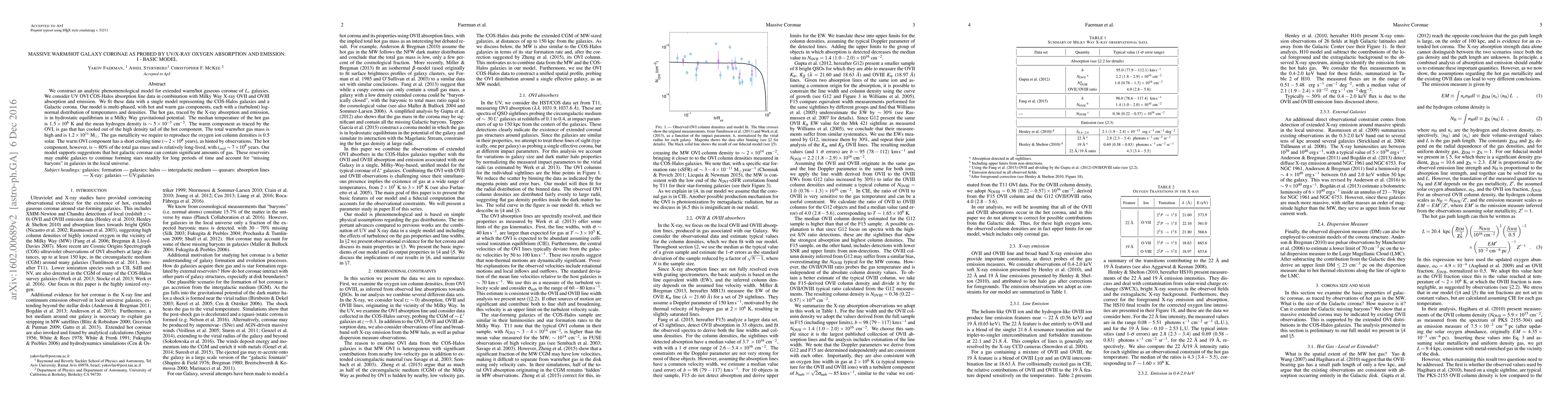This paper constructs an analytic model for the extended warm/hot gaseous coronae of $L_*$ galaxies, using UV/X-ray oxygen absorption and emission data. The model reveals that hot galactic coronae contain significant gas masses, potentially enabling sustained star formation and accounting for "missing baryons" in the local universe.