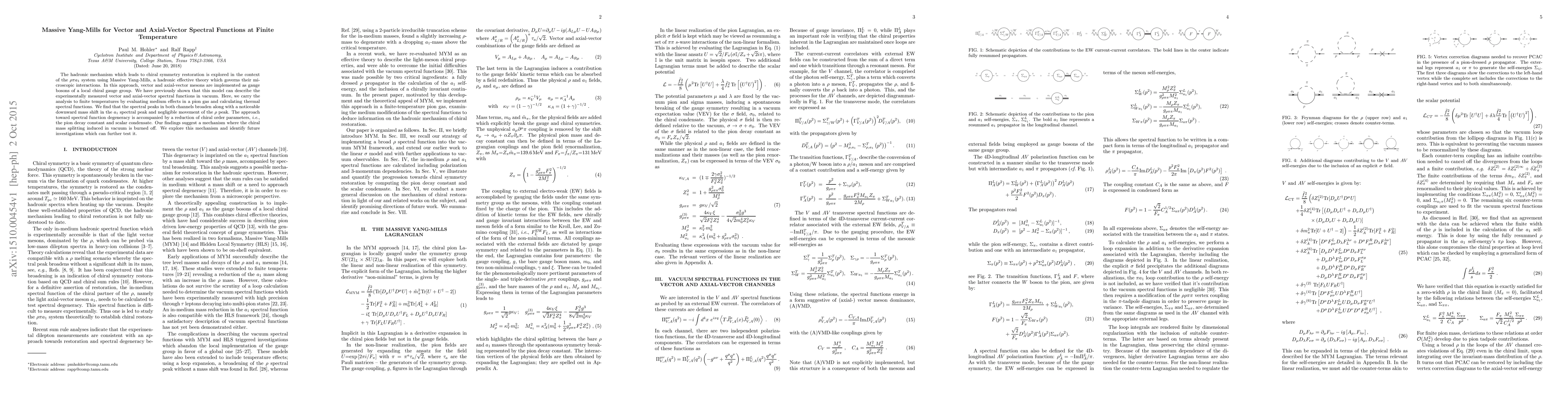 The hadronic mechanism which leads to chiral symmetry restoration is explored in the context of the rho-pi-a_1 system using Massive Yang-Mills, a hadronic effective theory which governs their microscopic interactions. In this approach, vector and axial-vector mesons are implemented as gauge bosons of a local chiral gauge group. We have previously shown that this model can describe the experimentally measured vector and axial-vector spectral functions in vacuum. Here, we carry the analysis to finite temperatures by evaluating medium effects in a pion gas and calculating thermal spectral functions. We find that the spectral peaks in both channels broaden along with a noticeable downward mass shift in the a_1 spectral peak and negligible movement of the rho peak. The approach toward spectral function degeneracy is accompanied by a reduction of chiral order parameters, i.e., the pion decay constant and scalar condensate. Our findings suggest a mechanism where the chiral mass splitting induced in vacuum is burned off. We explore this mechanism and identify future investigations which can further test it.