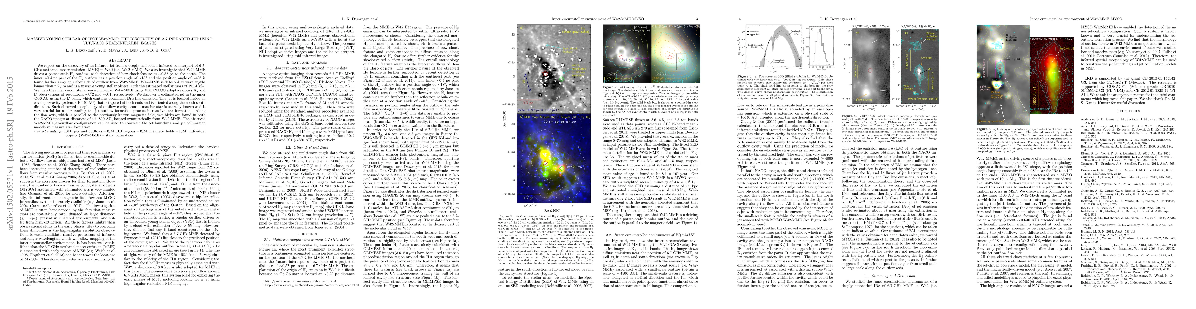 We report on the discovery of an infrared jet from a deeply embedded infrared counterpart of 6.7 GHz methanol maser emission (MME) in W42 (i.e. W42-MME). We also investigate that W42-MME drives a parsec-scale H2 outflow, with detection of bow shock feature at ~0.52 pc to the north. The inner ~0.4 pc part of the H2 outflow has a position angle of ~18 deg and the position angle of ~40 deg is found farther away on either side of outflow from W42-MME. W42-MME is detected at wavelengths longer than 2.2 microns and is a massive young stellar object, with the estimated stellar mass of 19+-4 Msun. We map the inner circumstellar environment of W42-MME using VLT/NACO adaptive optics Ks and L' observations at resolutions ~0.2 arcsec and ~0.1 arcsec, respectively. We discover a collimated jet in the inner 4500 AU using the L' band, which contains prominent Br alpha line emission. The jet is located inside an envelope/cavity (extent ~10640 AU) that is tapered at both ends and is oriented along the north-south direction. Such observed morphology of outflow cavity around massive star is scarcely known and is very crucial for understanding the jet-outflow formation process in massive star formation. Along the flow axis, which is parallel to the previously known magnetic field, two blobs are found in both the NACO images at distances of ~11800 AU, located symmetrically from W42-MME. The observed W42-MME jet-outflow configuration can be used to constrain the jet launching and jet collimation models in massive star formation.