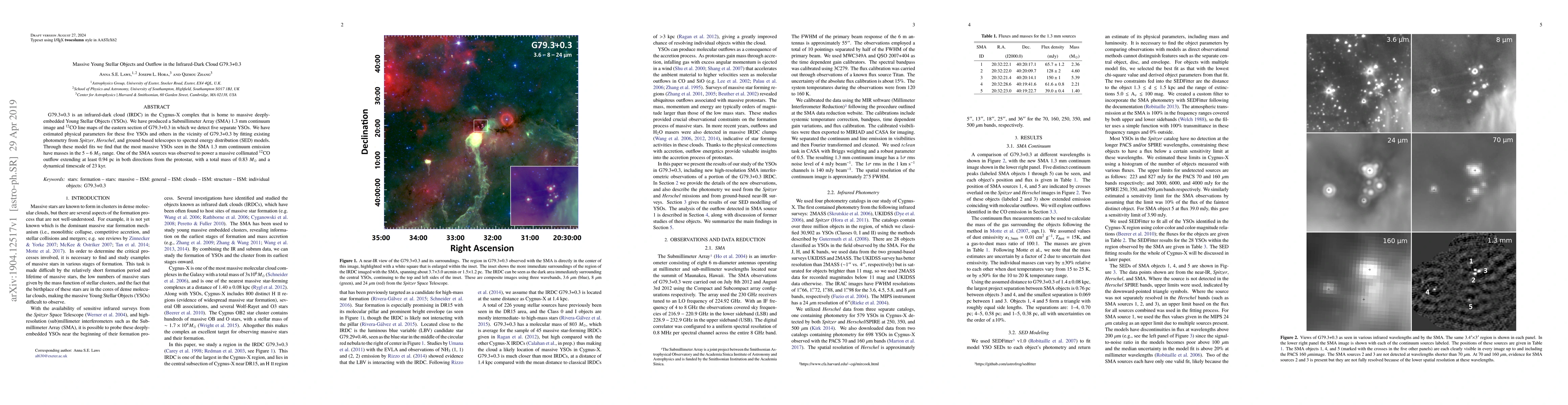 This paper investigates the infrared-dark cloud G79.3+0.3, identifying five massive young stellar objects (YSOs) using submillimeter array imaging. The study estimates YSO masses up to 6 solar masses and observes a powerful CO outflow from one YSO, indicating significant star formation activity.