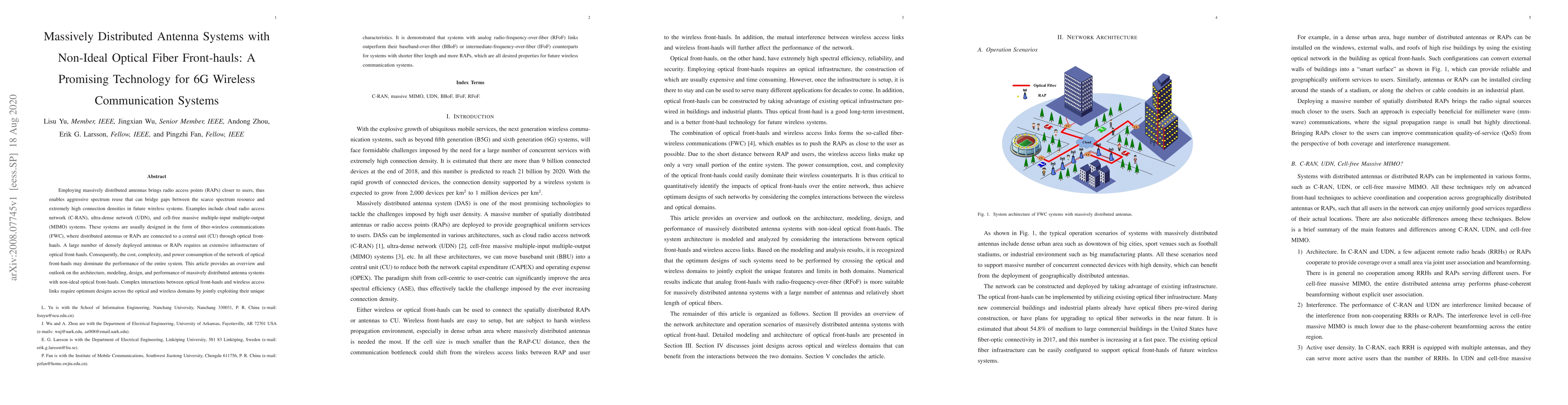 This paper explores the architecture and performance of massively distributed antenna systems with non-ideal optical front-hauls for 6G wireless communication, emphasizing the trade-offs between cost, complexity, and performance. It highlights that RFoF links are more effective than BBoF or IFoF links for systems with shorter fiber lengths and more radio access points, crucial for future dense network deployments.