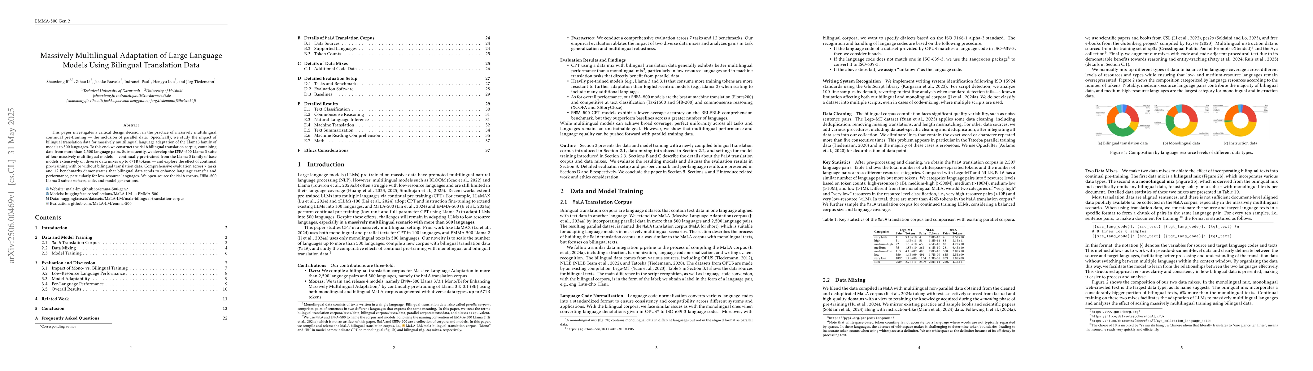 This research investigates the impact of bilingual translation data on massively multilingual adaptation of Llama3 models, constructing the MaLA bilingual translation corpus with data from over 2,500 language pairs and continually pre-training four EMMA-500 Llama 3 models on diverse data mixes.
