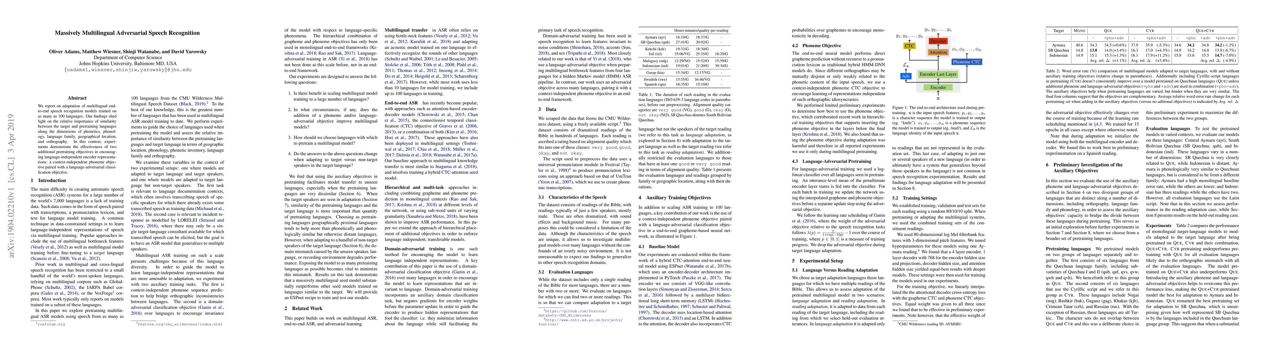 We report on adaptation of multilingual end-to-end speech recognition models trained on as many as 100 languages. Our findings shed light on the relative importance of similarity between the target and pretraining languages along the dimensions of phonetics, phonology, language family, geographical location, and orthography. In this context, experiments demonstrate the effectiveness of two additional pretraining objectives in encouraging language-independent encoder representations: a context-independent phoneme objective paired with a language-adversarial classification objective.