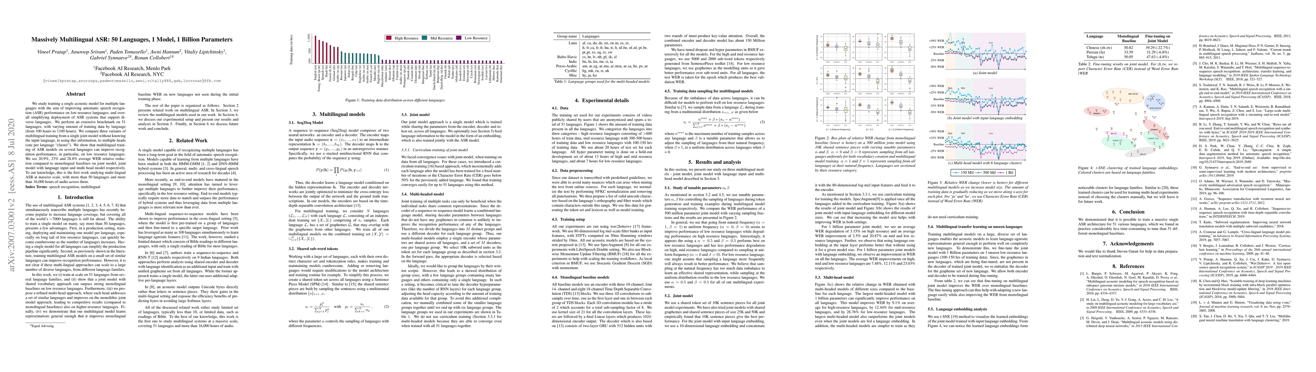 We study training a single acoustic model for multiple languages with the aim of improving automatic speech recognition (ASR) performance on low-resource languages, and over-all simplifying deployment of ASR systems that support diverse languages. We perform an extensive benchmark on 51 languages, with varying amount of training data by language(from 100 hours to 1100 hours). We compare three variants of multilingual training from a single joint model without knowing the input language, to using this information, to multiple heads (one per language cluster). We show that multilingual training of ASR models on several languages can improve recognition performance, in particular, on low resource languages. We see 20.9%, 23% and 28.8% average WER relative reduction compared to monolingual baselines on joint model, joint model with language input and multi head model respectively. To our knowledge, this is the first work studying multilingual ASR at massive scale, with more than 50 languages and more than 16,000 hours of audio across them.