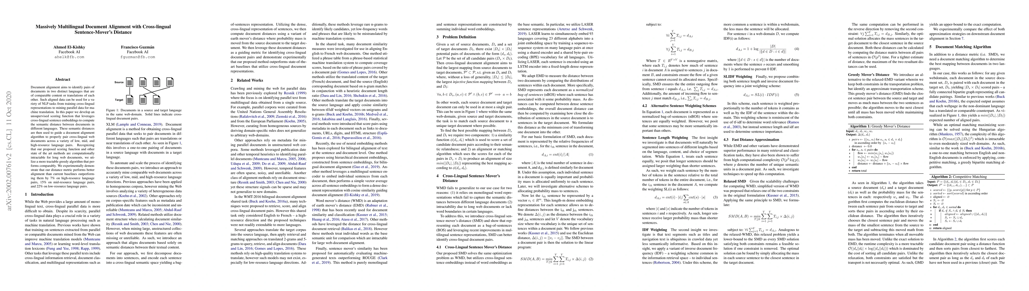 This paper proposes an unsupervised scoring function using cross-lingual sentence embeddings to compute semantic distances between documents in different languages, enhancing document alignment across various language pairs. The method outperforms current baselines by 7%, 15%, and 22% on high, mid, and low-resource language pairs respectively, while employing a more efficient greedy algorithm for scalability.