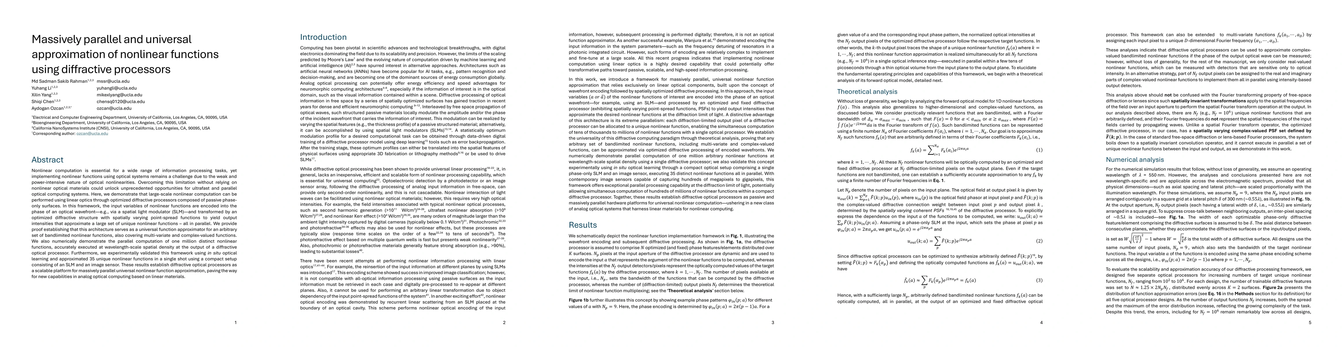 Nonlinear computation is essential for a wide range of information processing tasks, yet implementing nonlinear functions using optical systems remains a challenge due to the weak and power-intensive nature of optical nonlinearities. Overcoming this limitation without relying on nonlinear optical materials could unlock unprecedented opportunities for ultrafast and parallel optical computing systems. Here, we demonstrate that large-scale nonlinear computation can be performed using linear optics through optimized diffractive processors composed of passive phase-only surfaces. In this framework, the input variables of nonlinear functions are encoded into the phase of an optical wavefront, e.g., via a spatial light modulator (SLM), and transformed by an optimized diffractive structure with spatially varying point-spread functions to yield output intensities that approximate a large set of unique nonlinear functions, all in parallel. We provide proof establishing that this architecture serves as a universal function approximator for an arbitrary set of bandlimited nonlinear functions, also covering multi-variate and complex-valued functions. We also numerically demonstrate the parallel computation of one million distinct nonlinear functions, accurately executed at wavelength-scale spatial density at the output of a diffractive optical processor. Furthermore, we experimentally validated this framework using in situ optical learning and approximated 35 unique nonlinear functions in a single shot using a compact setup consisting of an SLM and an image sensor. These results establish diffractive optical processors as a scalable platform for massively parallel universal nonlinear function approximation, paving the way for new capabilities in analog optical computing based on linear materials.
