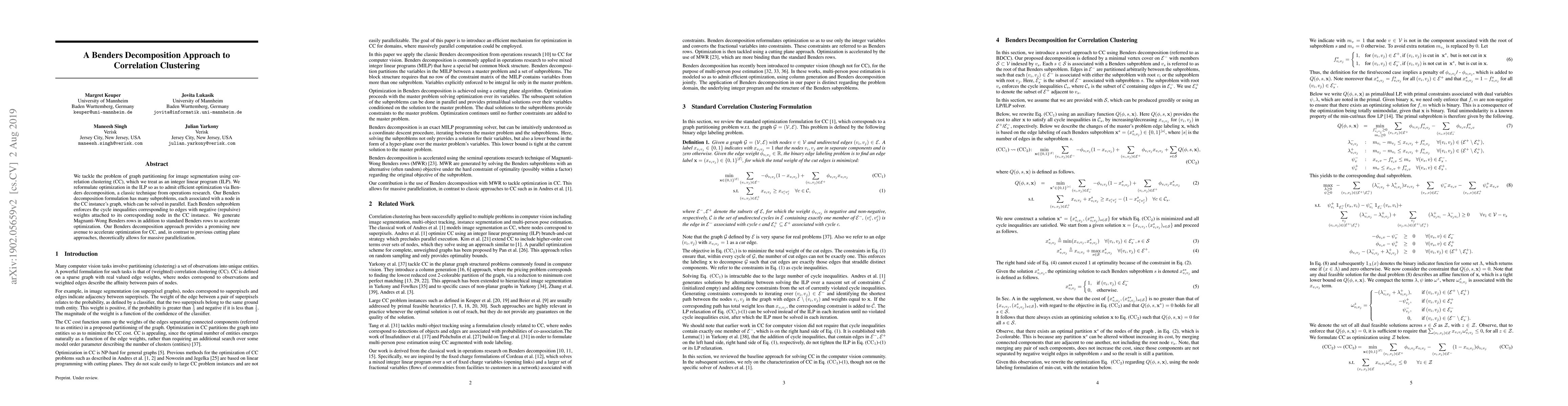 This paper proposes a massively parallel Benders decomposition method to optimize correlation clustering for image segmentation. By reformulating the problem as an integer linear program, the authors leverage Benders decomposition to parallelize the solution of subproblems, significantly accelerating the optimization process.