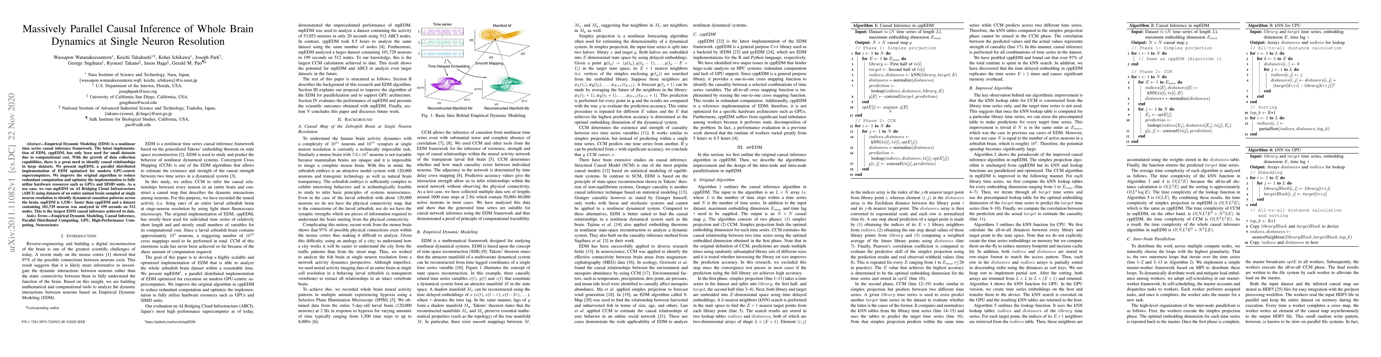 Empirical Dynamic Modeling (EDM) is a nonlinear time series causal inference framework. The latest implementation of EDM, cppEDM, has only been used for small datasets due to computational cost. With the growth of data collection capabilities, there is a great need to identify causal relationships in large datasets. We present mpEDM, a parallel distributed implementation of EDM optimized for modern GPU-centric supercomputers. We improve the original algorithm to reduce redundant computation and optimize the implementation to fully utilize hardware resources such as GPUs and SIMD units. As a use case, we run mpEDM on AI Bridging Cloud Infrastructure (ABCI) using datasets of an entire animal brain sampled at single neuron resolution to identify dynamical causation patterns across the brain. mpEDM is 1,530 X faster than cppEDM and a dataset containing 101,729 neuron was analyzed in 199 seconds on 512 nodes. This is the largest EDM causal inference achieved to date.