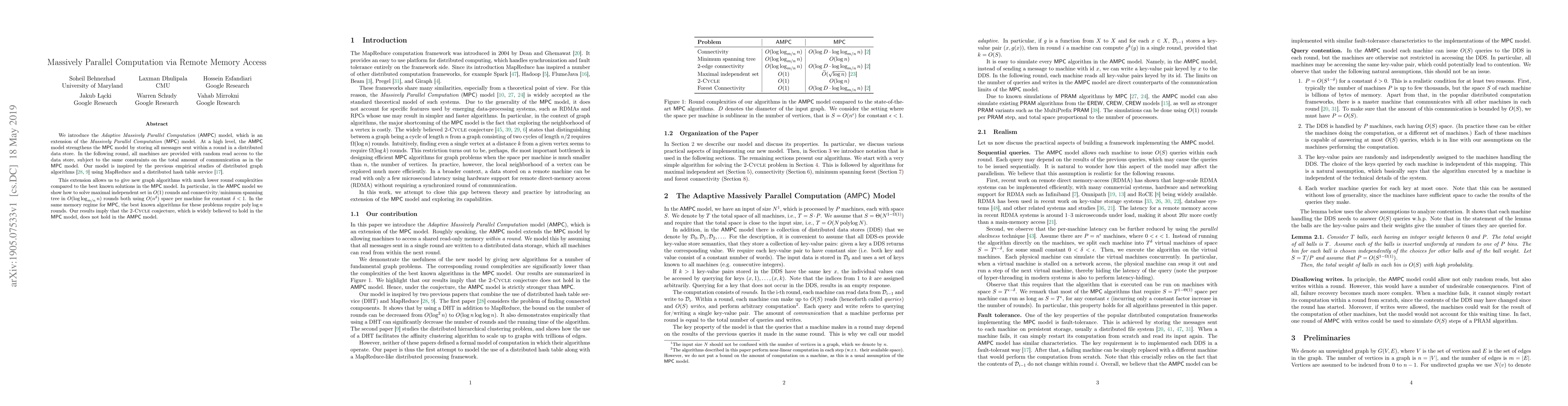 The Adaptive Massively Parallel Computation (AMPC) model and new graph algorithms for solving maximal independent set and connectivity/minimum spanning tree problems with improved round complexities.