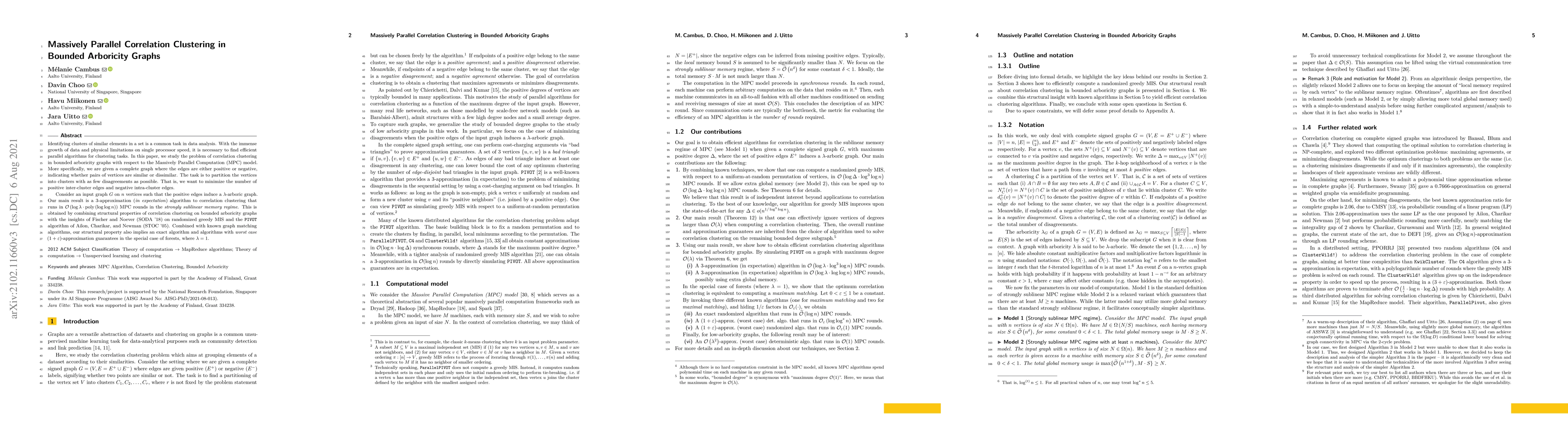 This paper presents a massively parallel correlation clustering algorithm for bounded arboricity graphs, achieving a 3-approximation in $\mathcal{O}(\log \lambda \cdot \text{poly}(\log \log n))$ MPC rounds. It leverages structural properties and combines insights from randomized greedy MIS and the PIVOT algorithm for optimal performance.