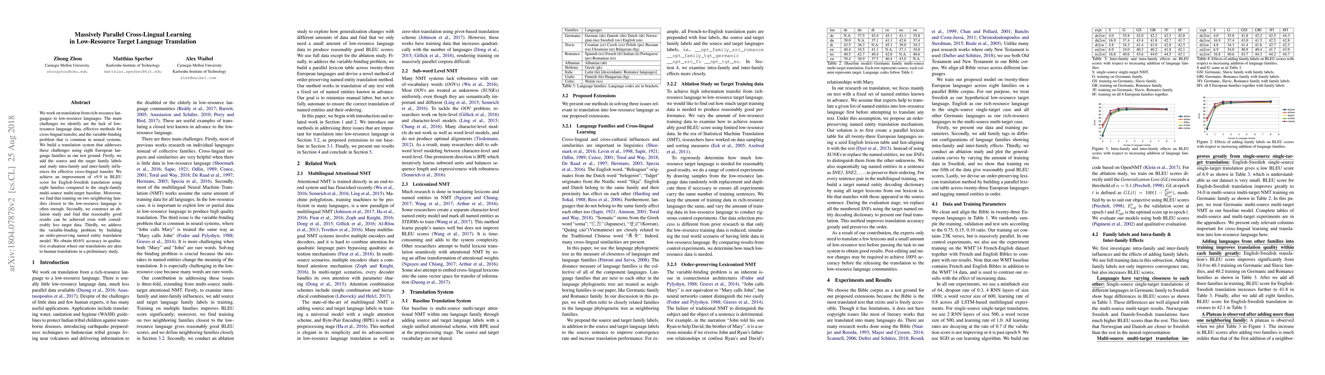 This paper develops a translation system for low-resource languages using massively parallel cross-lingual learning, achieving a +9.9 BLEU score improvement in English-Swedish translation by leveraging eight European language families. It also addresses the variable-binding problem with an order-preserving named entity translation model, achieving 60.6% accuracy in qualitative evaluation.