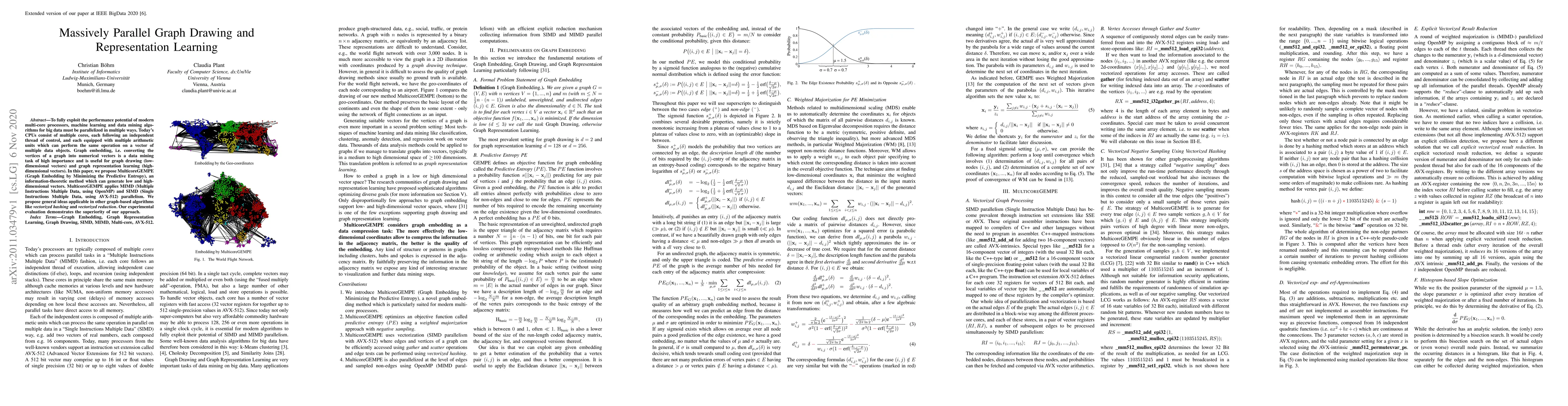 To fully exploit the performance potential of modern multi-core processors, machine learning and data mining algorithms for big data must be parallelized in multiple ways. Today's CPUs consist of multiple cores, each following an independent thread of control, and each equipped with multiple arithmetic units which can perform the same operation on a vector of multiple data objects. Graph embedding, i.e. converting the vertices of a graph into numerical vectors is a data mining task of high importance and is useful for graph drawing (low-dimensional vectors) and graph representation learning (high-dimensional vectors). In this paper, we propose MulticoreGEMPE (Graph Embedding by Minimizing the Predictive Entropy), an information-theoretic method which can generate low and high-dimensional vectors. MulticoreGEMPE applies MIMD (Multiple Instructions Multiple Data, using OpenMP) and SIMD (Single Instructions Multiple Data, using AVX-512) parallelism. We propose general ideas applicable in other graph-based algorithms like \emph{vectorized hashing} and \emph{vectorized reduction}. Our experimental evaluation demonstrates the superiority of our approach.