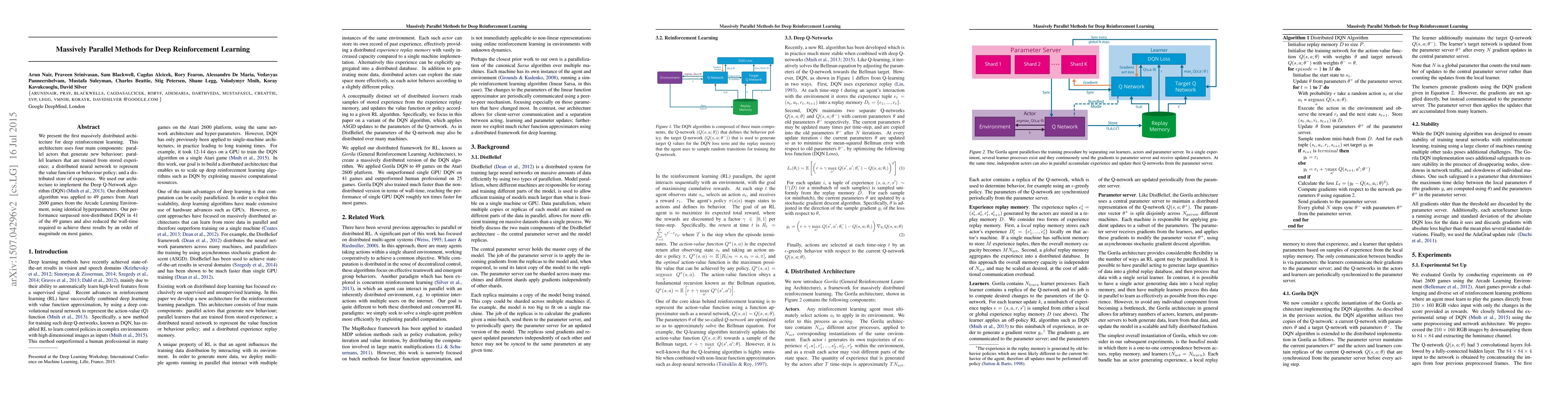This paper introduces a massively parallel architecture for deep reinforcement learning, utilizing parallel actors, learners, a distributed neural network, and an experience store. The implementation of the Deep Q-Network algorithm in this distributed framework significantly outperformed non-distributed DQN in 41 out of 49 Atari games, while reducing training time by an order of magnitude.