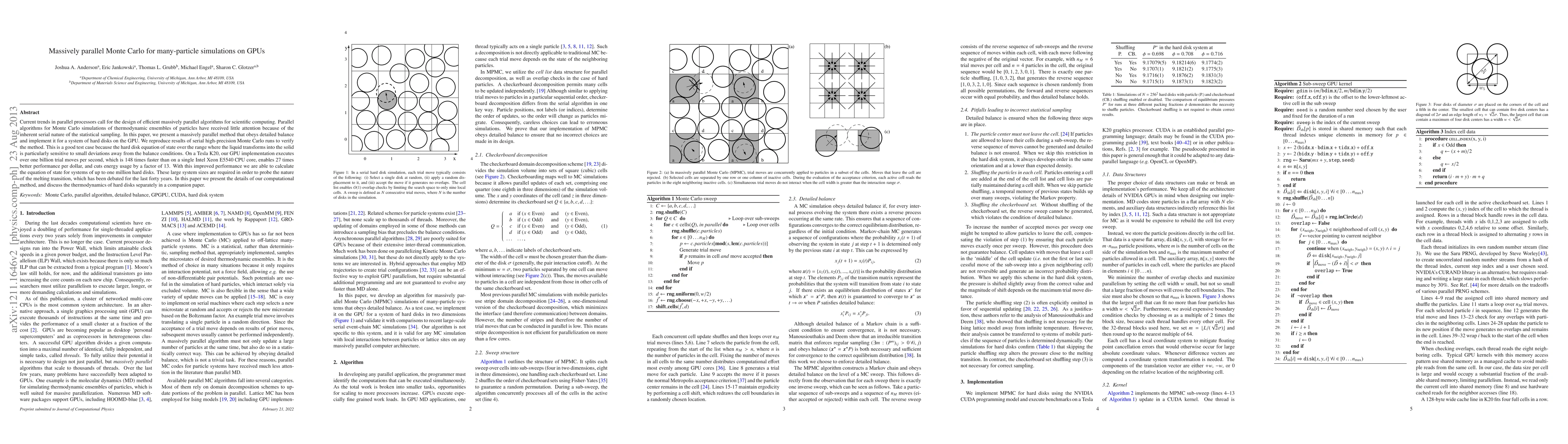 This paper introduces a massively parallel Monte Carlo algorithm for simulating thermodynamic ensembles of particles on GPUs, achieving significant speedups and energy savings compared to CPU-based methods. The method is validated for hard disk systems, enabling the study of large systems up to one million particles to investigate the melting transition.