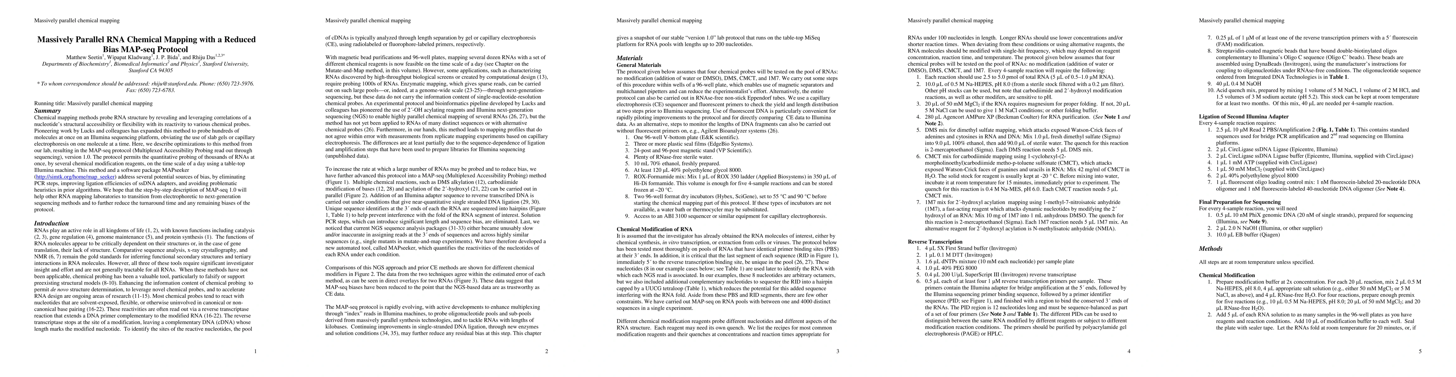 This paper presents an optimized MAP-seq protocol for massively parallel RNA chemical mapping, reducing bias and improving efficiency through the elimination of PCR steps and enhanced ligation. The method allows for the high-throughput probing of thousands of RNAs using next-generation sequencing, significantly reducing turnaround time.