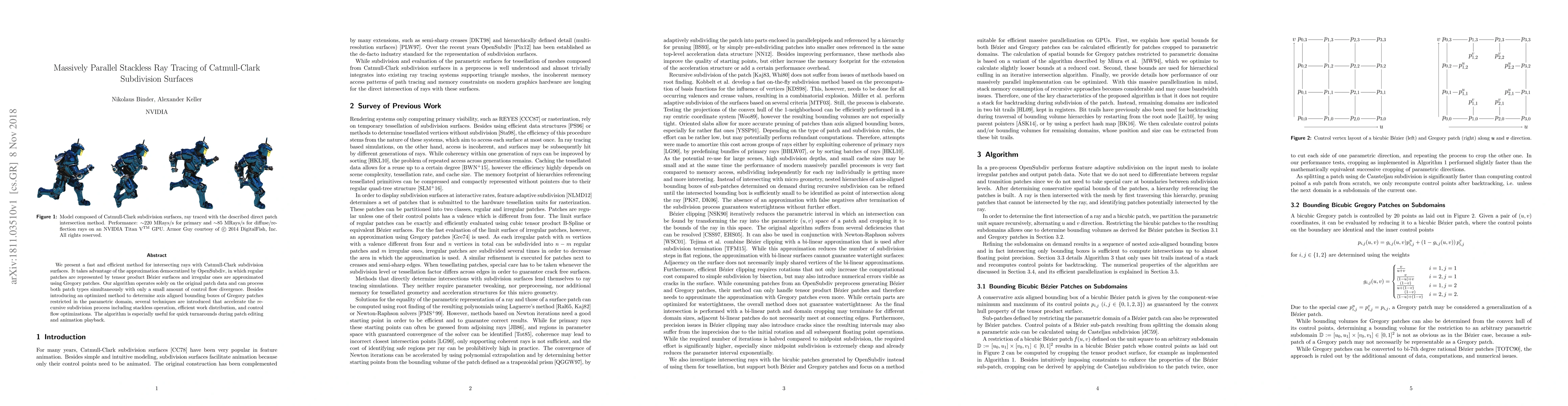 This paper introduces a massively parallel stackless ray tracing method for Catmull-Clark subdivision surfaces, leveraging OpenSubdiv's approximation techniques. It efficiently processes both regular and irregular patches with minimal control flow divergence and accelerates recursive subdivision through optimized bounding box calculations and work distribution.
