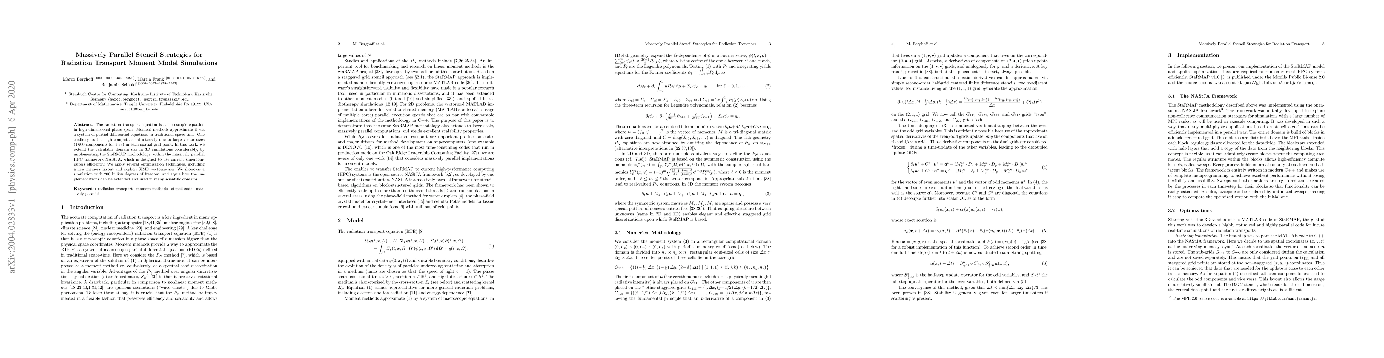 The radiation transport equation is a mesoscopic equation in high dimensional phase space. Moment methods approximate it via a system of partial differential equations in traditional space-time. One challenge is the high computational intensity due to large vector sizes (1600 components for P39) in each spatial grid point. In this work, we extend the calculable domain size in 3D simulations considerably, by implementing the StaRMAP methodology within the massively parallel HPC framework NAStJA, which is designed to use current supercomputers efficiently. We apply several optimization techniques, including a new memory layout and explicit SIMD vectorization. We showcase a simulation with 200 billion degrees of freedom, and argue how the implementations can be extended and used in many scientific domains.