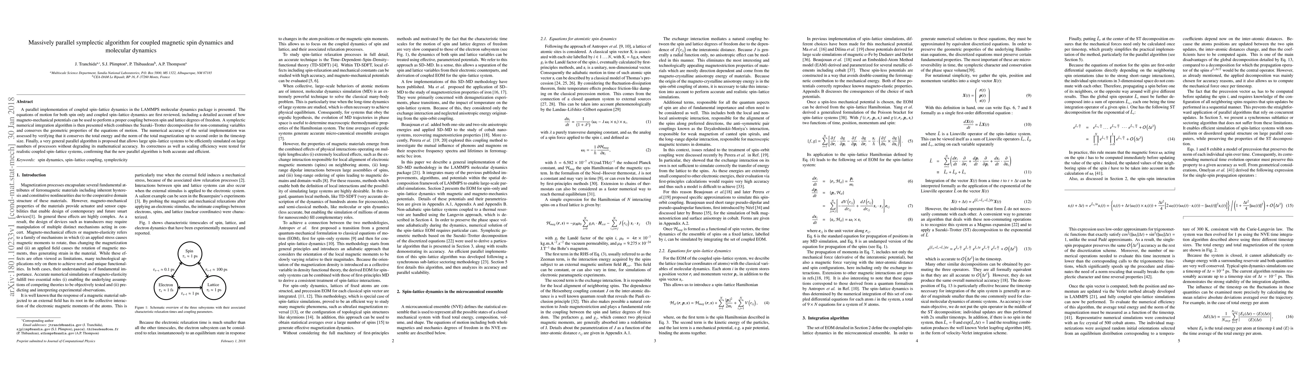 The research presents a parallel implementation of coupled spin-lattice dynamics in the LAMMPS molecular dynamics package, utilizing a symplectic numerical integration algorithm that combines Suzuki-Trotter decomposition for non-commuting variables, ensuring conservation of geometric properties of the equations of motion.