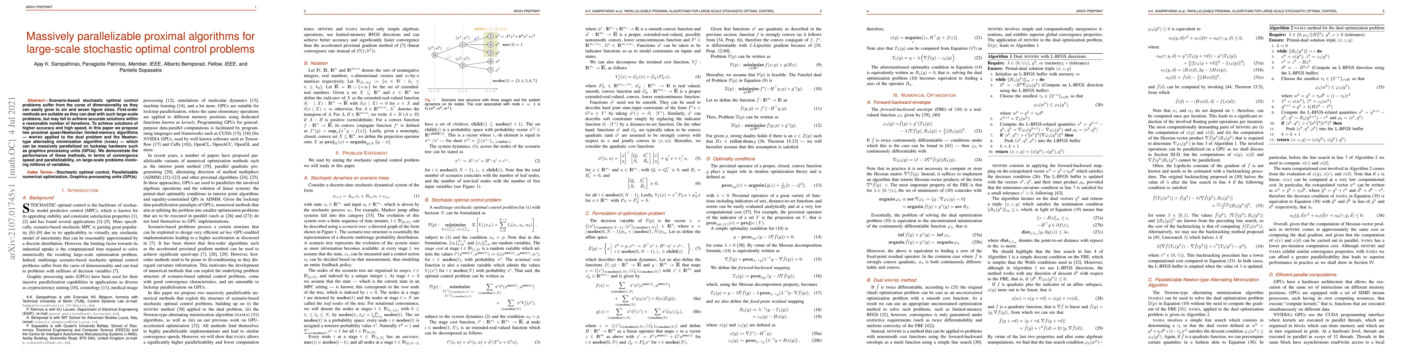 Researchers propose two algorithms for solving large-scale stochastic optimal control problems on parallel hardware like GPUs, aiming to achieve accurate solutions with high speed.