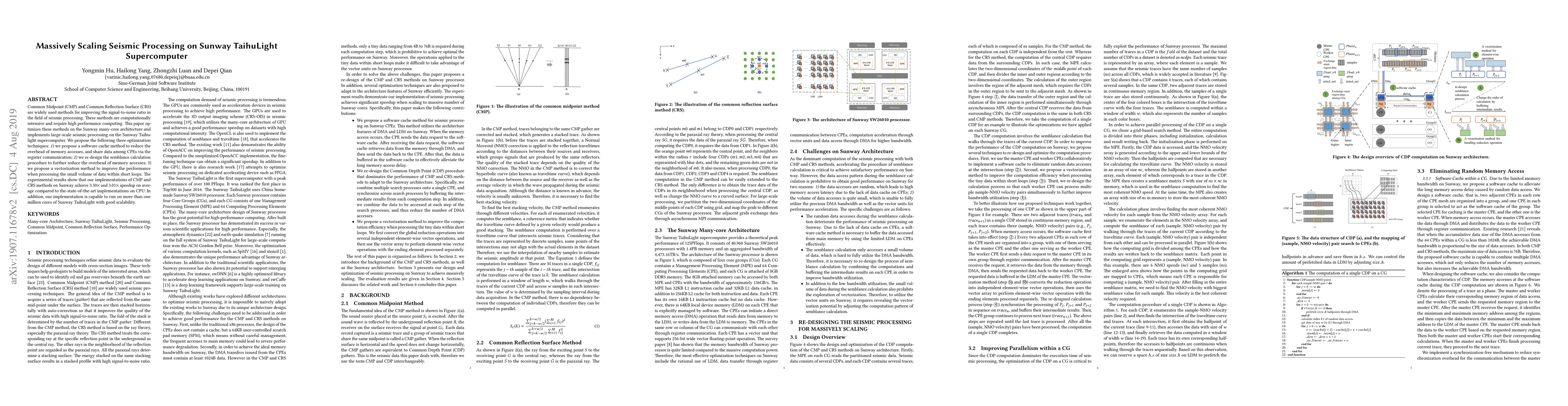 This paper optimizes Common Midpoint and Common Reflection Surface methods for seismic processing on the Sunway TaihuLight supercomputer, employing techniques like cache optimization, semblance calculation redesign, and vectorization to achieve significant speedups and scalability. Experimental results show a 3.50x and 3.01x average speedup compared to CPU-based implementations.