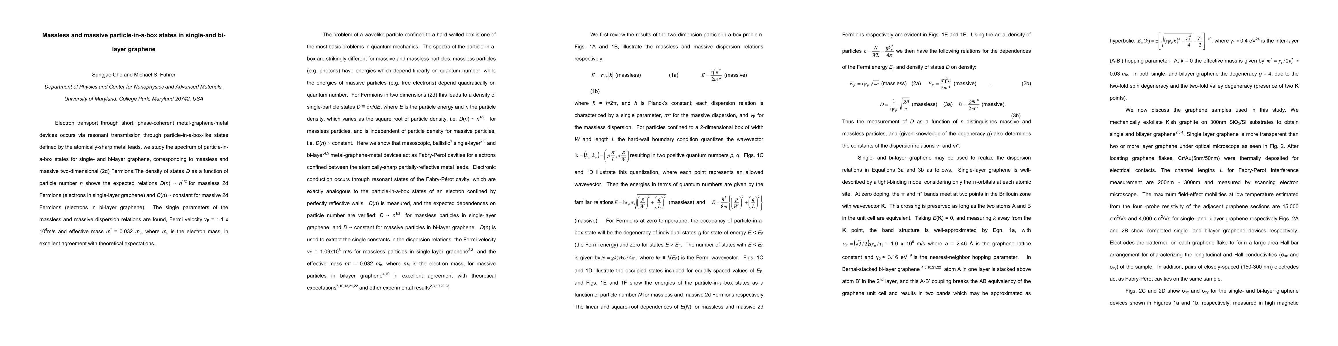 Electron transport through short, phase-coherent metal-graphene-metal devices occurs via resonant transmission through particle-in-a-box-like states defined by the atomically-sharp metal leads. we study the spectrum of particle-in-a-box states for single- and bi-layer graphene, corresponding to massless and massive two-dimensional (2d) Fermions.The density of states D as a function of particle number n shows the expected relations D(n) ~ n1/2 for massless 2d Fermions (electrons in single-layer graphene) and D(n) ~ constant for massive 2d Fermions (electrons in bi-layer graphene). The single parameters of the massless and massive dispersion relations are found, Fermi velocity vF = 1.1 x 106m/s and effective mass m* = 0.032 me, where me is the electron mass, in excellent agreement with theoretical expectations.