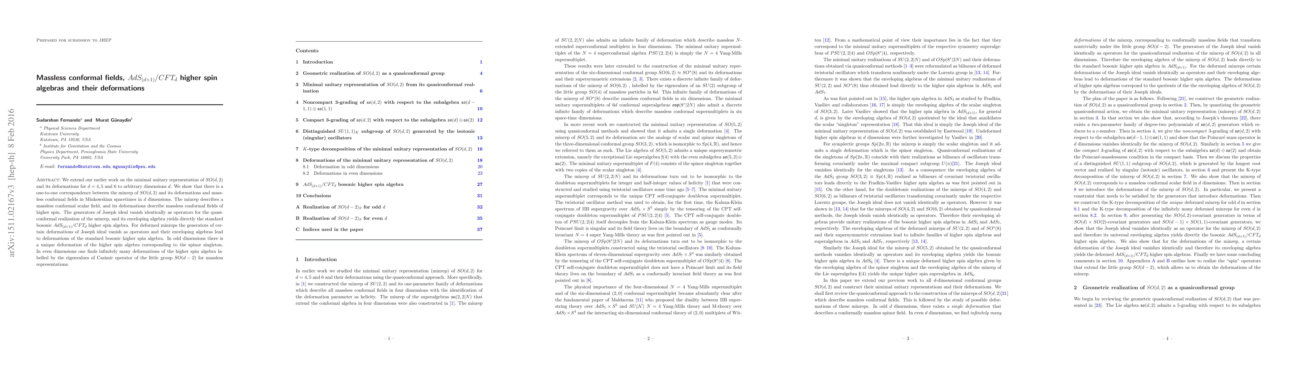 We extend our earlier work on the minimal unitary representation of $SO(d,2)$ and its deformations for $d=4,5$ and $6$ to arbitrary dimensions $d$. We show that there is a one-to-one correspondence between the minrep of $SO(d,2)$ and its deformations and massless conformal fields in Minkowskian spacetimes in $d$ dimensions. The minrep describes a massless conformal scalar field, and its deformations describe massless conformal fields of higher spin. The generators of Joseph ideal vanish identically as operators for the quasiconformal realization of the minrep, and its enveloping algebra yields directly the standard bosonic $AdS_{(d+1)}/CFT_d$ higher spin algebra. For deformed minreps the generators of certain deformations of Joseph ideal vanish as operators and their enveloping algebras lead to deformations of the standard bosonic higher spin algebra. In odd dimensions there is a unique deformation of the higher spin algebra corresponding to the spinor singleton. In even dimensions one finds infinitely many deformations of the higher spin algebra labelled by the eigenvalues of Casimir operator of the little group $SO(d-2)$ for massless representations.