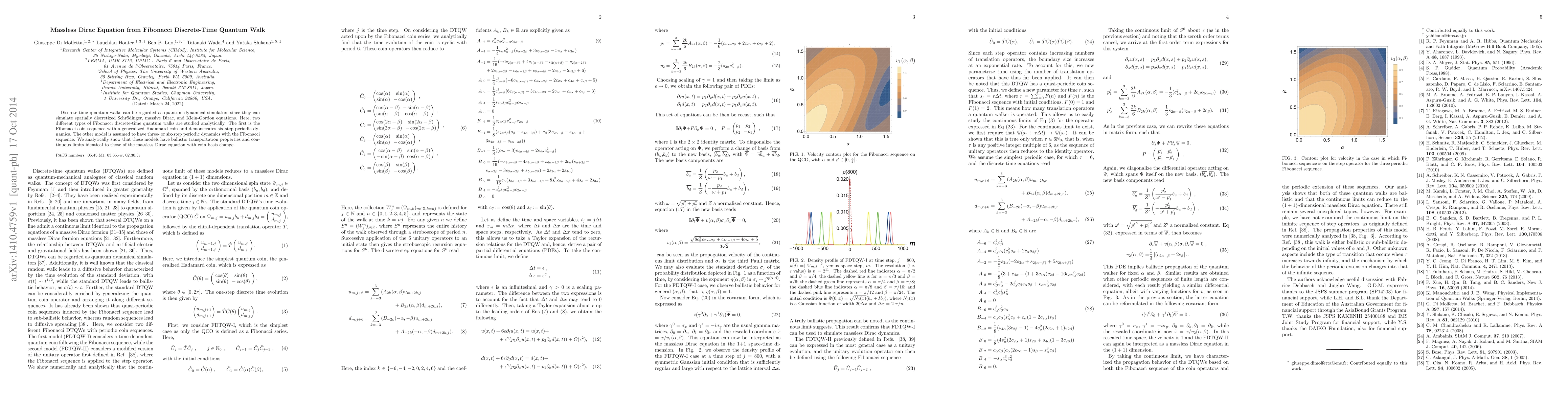 Discrete-time quantum walks can be regarded as quantum dynamical simulators since they can simulate spatially discretized Schr\"{o}dinger, massive Dirac, and Klein-Gordon equations. Here, two different types of Fibonacci discrete-time quantum walks are studied analytically. The first is the Fibonacci coin sequence with a generalized Hadamard coin and demonstrates six-step periodic dynamics. The other model is assumed to have three- or six-step periodic dynamics with the Fibonacci sequence. We analytically show that these models have ballistic transportation properties and continuous limits identical to those of the massless Dirac equation with coin basis change.
