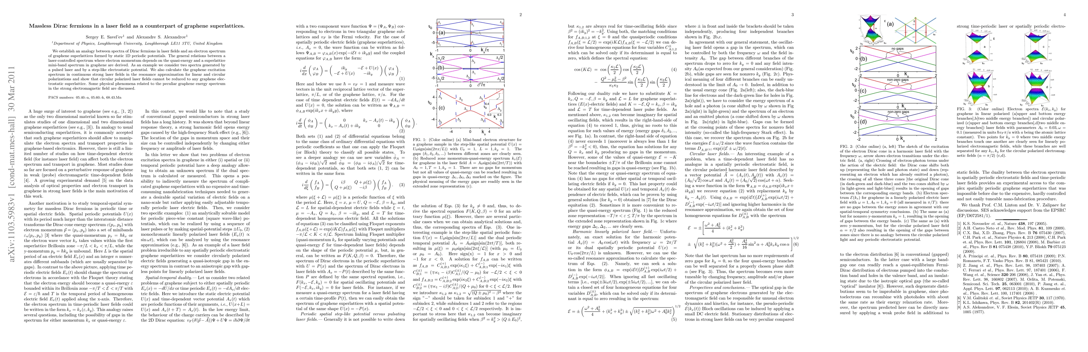 The paper establishes an analogy between Dirac fermions in laser fields and graphene superlattices, deriving relations between laser-controlled spectra and superlattice mini-band spectra. It shows that circularly polarized laser fields cannot mimic graphene electrostatic superlattices, discussing unique physical phenomena in graphene under strong electromagnetic fields.