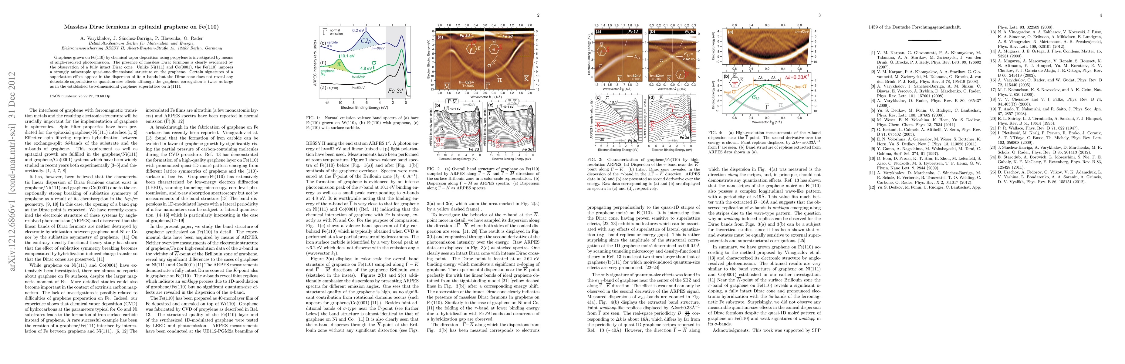 Graphene grown on Fe(110)by chemical vapor deposition using propylene is investigated by means of angle-resolved photoemission. The presence of massless Dirac fermions is clearly evidenced by the observation of a fully intact Dirac cone. Unlike Ni(111) and Co(0001), the Fe(110) imposes a strongly anisotropic quasi-one-dimensional structure on the graphene. Certain signatures of a superlattice effect appear in the dispersion of its \sigma-bands but the Dirac cone does not reveal any detectable superlattice or quantum-size effects although the graphene corrugation is twice as large as in the established two-dimensional graphene superlattice on Ir(111).