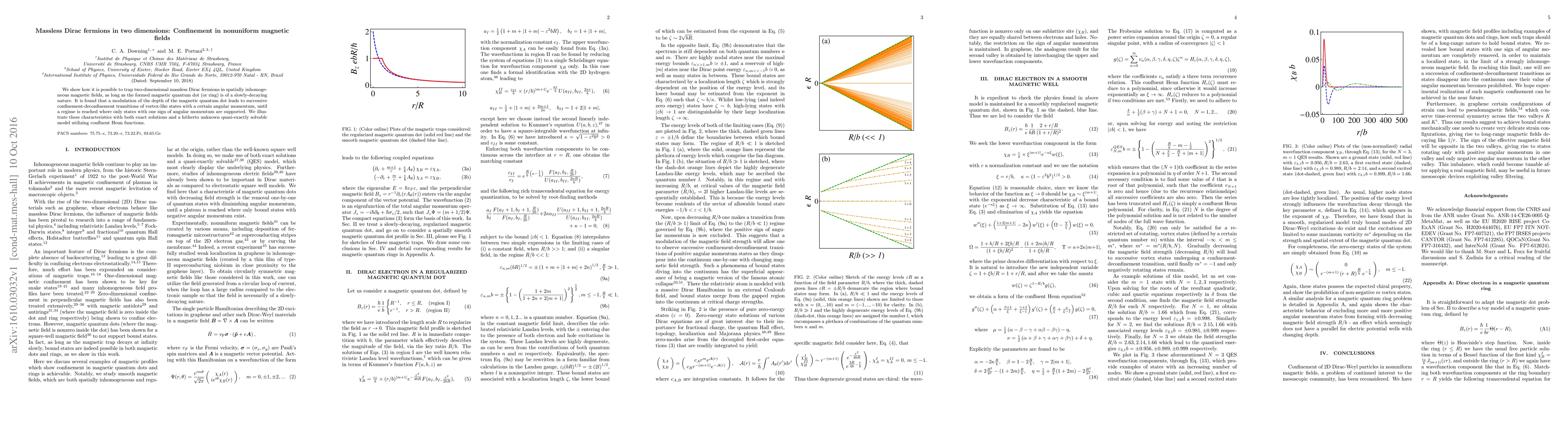 We show how it is possible to trap two-dimensional massless Dirac fermions in spatially inhomogeneous magnetic fields, as long as the formed magnetic quantum dot (or ring) is of a slowly decaying nature. It is found that a modulation of the depth of the magnetic quantum dot leads to successive confinement-deconfinement transitions of vortexlike states with a certain angular momentum, until a regime is reached where only states with one sign of angular momentum are supported. We illustrate these characteristics with both exact solutions and a hitherto unknown quasi-exactly solvable model utilizing confluent Heun functions.