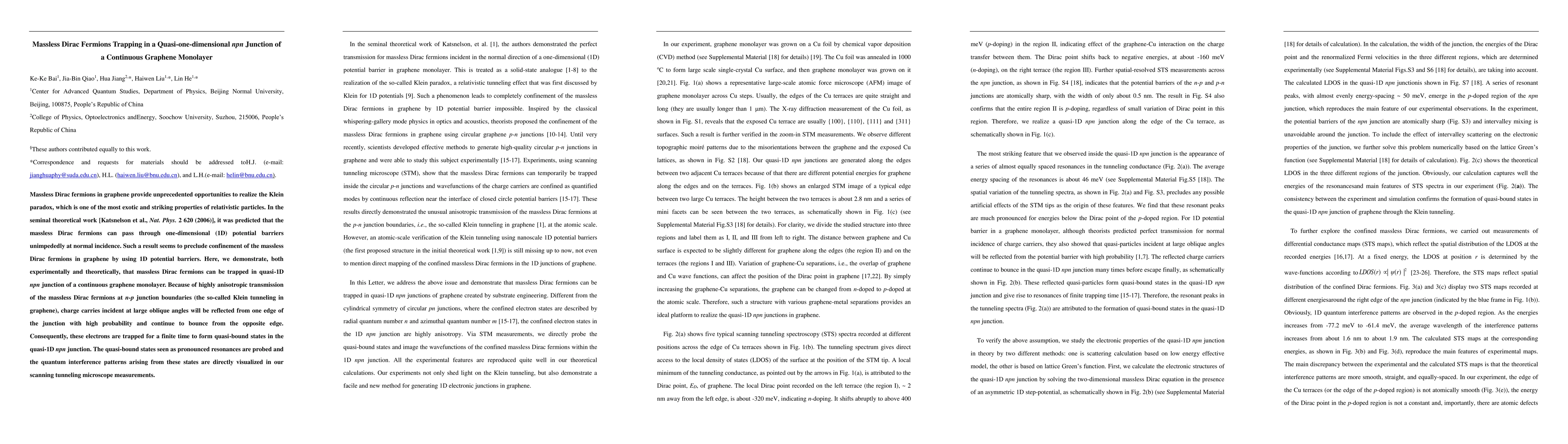 This paper experimentally and theoretically demonstrates trapping of massless Dirac fermions in a quasi-1D npn junction of a continuous graphene monolayer, showing that these fermions can be confined through Klein tunneling, forming quasi-bound states observable as resonances and visualized via scanning tunneling microscopy.