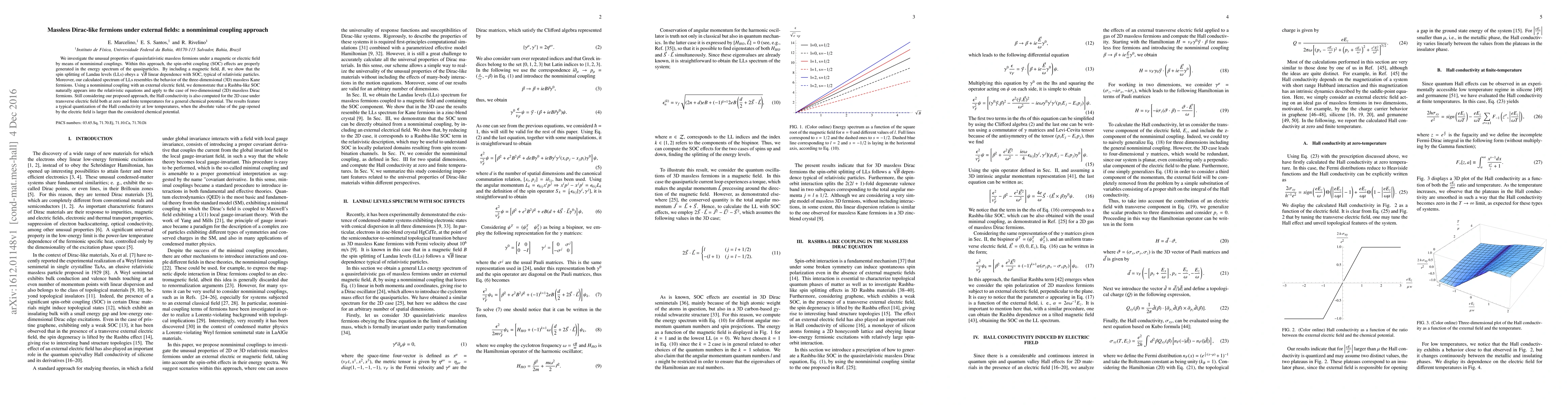 We investigate the unusual properties of quasirelativistic massless fermions under a magnetic or electric field by means of nonminimal couplings. Within this approach, the spin-orbit coupling (SOC) effects are properly generated in the energy spectrum of the quasiparticles. By including a magnetic field, $B$, we show that the spin splitting of Landau Levels (LL) obeys a $\sqrt{B}$ linear dependence with SOC, typical of relativistic particles. Moreover, our calculated spectrum of LLs resembles the behavior of the three-dimensional (3D) massless Kane fermions. Using a nonminimal coupling with an external electric field, we demonstrate that a Rashba-like SOC naturally appears into the relativistic equations and apply to the case of two-dimensional (2D) massless Dirac fermions. Still considering our proposed approach, the Hall conductivity is also computed for the 2D case under transverse electric field both at zero and finite temperatures for a general chemical potential. The results feature a typical quantization of the Hall conductivity at low temperatures, when the absolute value of the gap opened by the electric field is larger than the considered chemical potential.