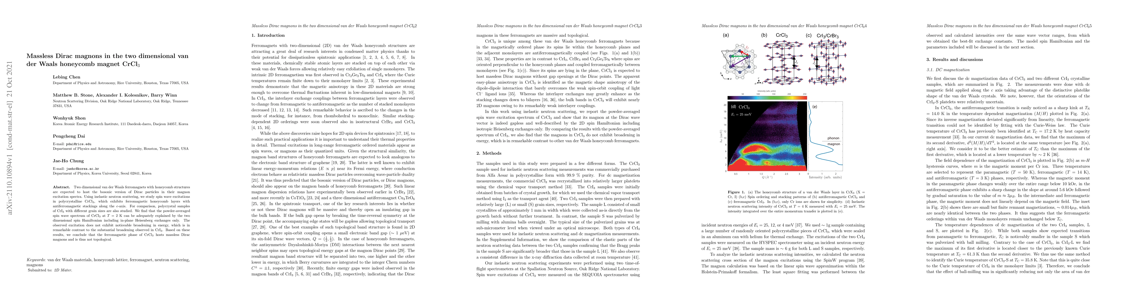 Two dimensional van der Waals ferromagnets with honeycomb structures are expected to host the bosonic version of Dirac particles in their magnon excitation spectra. Using inelastic neutron scattering, we study spin wave excitations in polycrystalline CrCl$_3$, which exhibits ferromagnetic honeycomb layers with antiferromagnetic stackings along the $c$-axis. For comparison, polycrystal samples of CrI$_3$ with different grain sizes are also studied. We find that the powder-averaged spin wave spectrum of CrCl$_3$ at $T$ = 2 K can be adequately explained by the two dimensional spin Hamiltonian including in-plane Heisenberg exchanges only. The observed excitation does not exhibit noticeable broadening in energy, which is in remarkable contrast to the substantial broadening observed in CrI$_3$. Based on these results, we conclude that the ferromagnetic phase of CrCl$_3$ hosts massless Dirac magnons and is thus not topological.