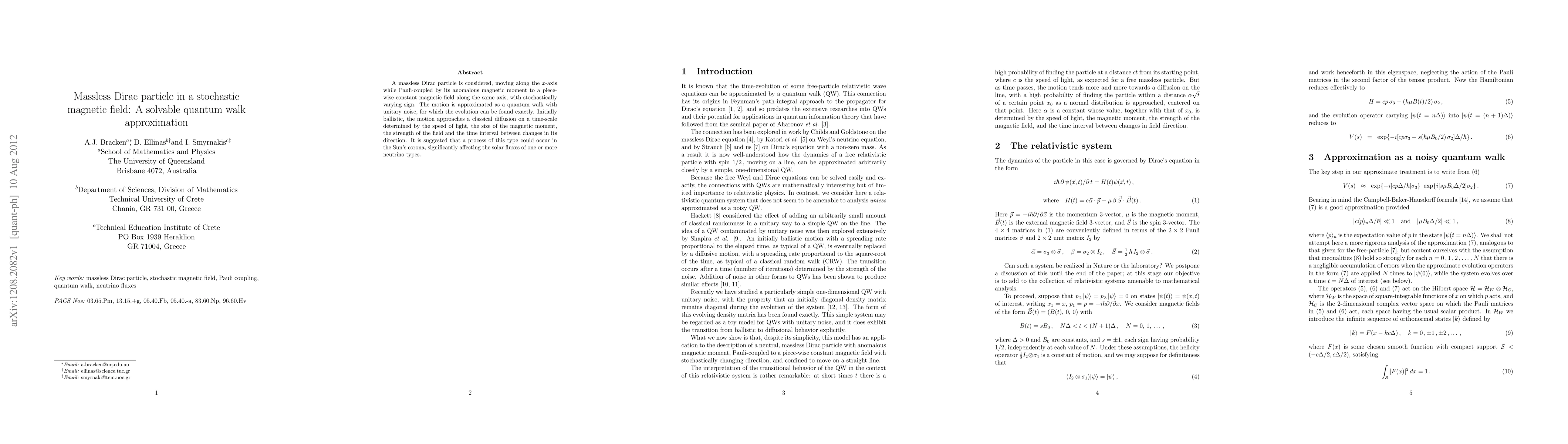 A massless Dirac particle is considered, moving along the x-axis while Pauli-coupled by its anomalous magnetic moment to a piecewise constant magnetic field along the same axis, with stochastically varying sign. The motion is approximated as a quantum walk with unitary noise, for which the evolution can be found exactly. Initially ballistic, the motion approaches a classical diffusion on a time-scale determined by the speed of light, the size of the magnetic moment, the strength of the field and the time interval between changes in its direction. It is suggested that a process of this type could occur in the Sun's corona, significantly affecting the solar fluxes of one or more neutrino types.