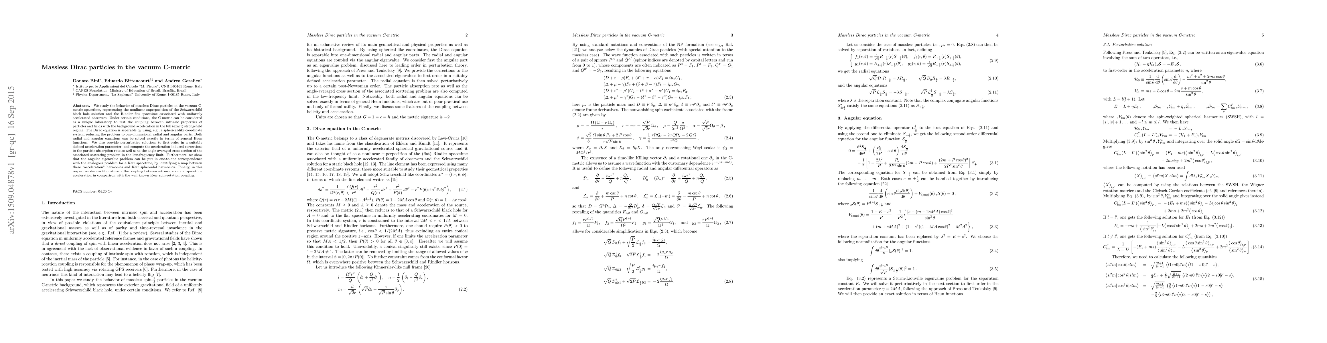 We study the behavior of massless Dirac particles in the vacuum C-metric spacetime, representing the nonlinear superposition of the Schwarzschild black hole solution and the Rindler flat spacetime associated with uniformly accelerated observers. Under certain conditions, the C-metric can be considered as a unique laboratory to test the coupling between intrinsic properties of particles and fields with the background acceleration in the full (exact) strong-field regime. The Dirac equation is separable by using, e.g., a spherical-like coordinate system, reducing the problem to one-dimensional radial and angular parts. Both radial and angular equations can be solved exactly in terms of general Heun functions. We also provide perturbative solutions to first-order in a suitably defined acceleration parameter, and compute the acceleration-induced corrections to the particle absorption rate as well as to the angle-averaged cross section of the associated scattering problem in the low-frequency limit. Furthermore, we show that the angular eigenvalue problem can be put in one-to-one correspondence with the analogous problem for a Kerr spacetime, by identifying a map between these "acceleration" harmonics and Kerr spheroidal harmonics. Finally, in this respect we discuss the nature of the coupling between intrinsic spin and spacetime acceleration in comparison with the well known Kerr spin-rotation coupling.