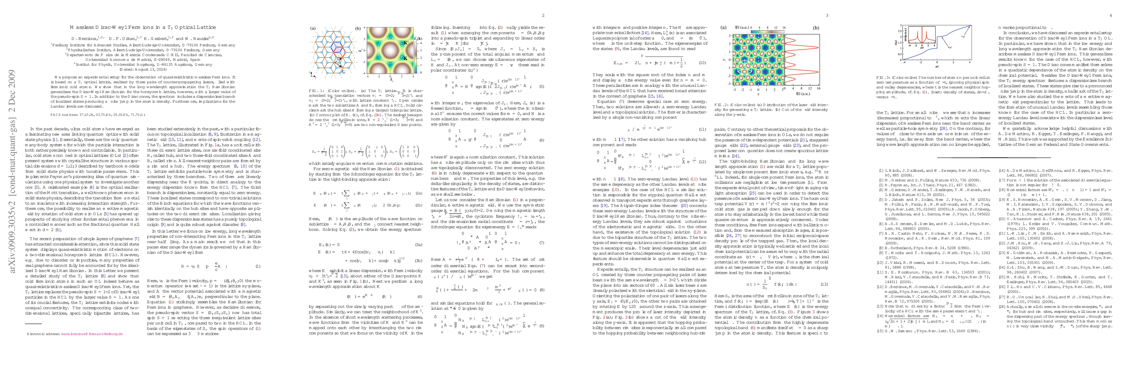 This research proposes an experimental setup to observe massless Dirac-Weyl fermions using a T_3 optical lattice with cold fermionic atoms. The T_3 lattice generalizes the Dirac-Weyl Hamiltonian, featuring pseudo-spin S=1 and a dispersionless branch of localized states.