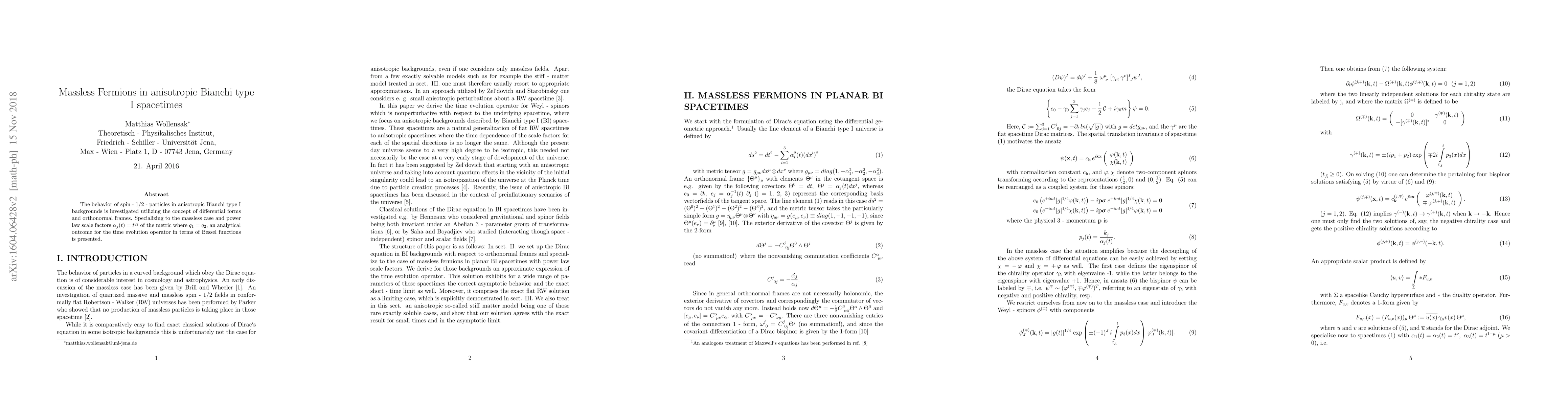 The behavior of spin - 1/2 - particles in anisotropic Bianchi type I backgrounds is investigated utilizing the concept of differential forms and orthonormal frames. Specializing to the massless case and power law scale factors $\alpha_j(t) = t^{q_j}$ of the metric where $q_1 = q_2 $, an analytical outcome for the time evolution operator in terms of Bessel functions is presented.