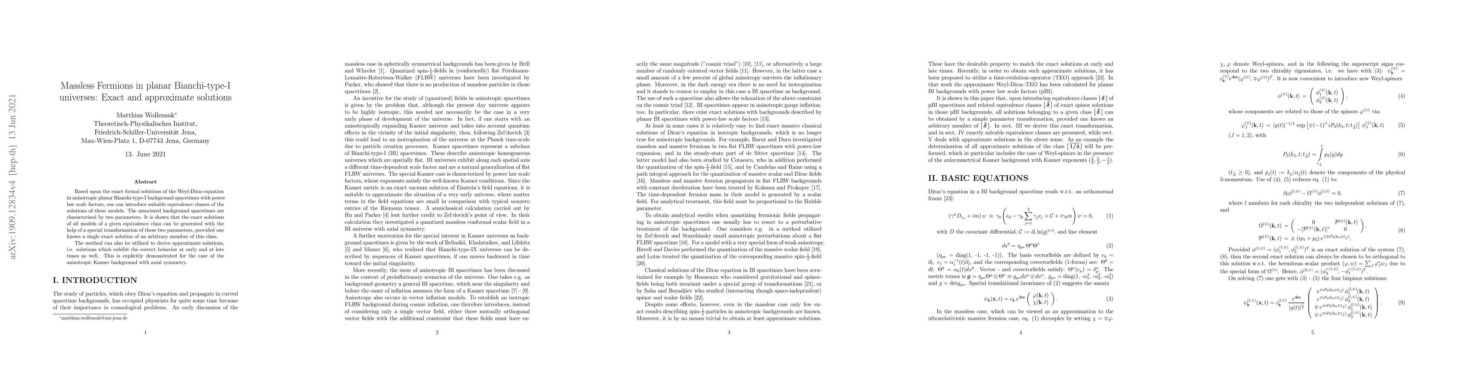This paper presents a method to generate exact solutions of massless fermion equations in anisotropic Bianchi-type-I universes using parameter transformations. It also extends this approach to derive approximate solutions that accurately describe early and late universe behaviors, demonstrated for an axially symmetric Kasner background.