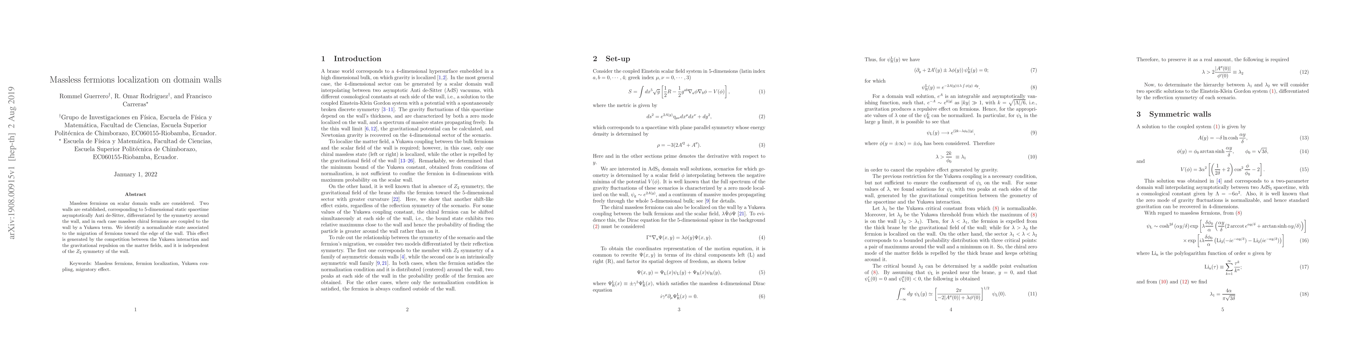 Massless fermions on scalar domain walls are considered. Two walls are established, corresponding to 5-dimensional static spacetime asymptotically Anti de-Sitter, differentiated by the symmetry around the wall, and in each case massless chiral fermions are coupled to the wall by a Yukawa term. We identify a normalizable state associated to the migration of fermions toward the edge of the wall. This effect is generated by the competition between the Yukawa interaction and the gravitational repulsion on the matter fields, and it is independent of the $Z_2$ symmetry of the wall.
