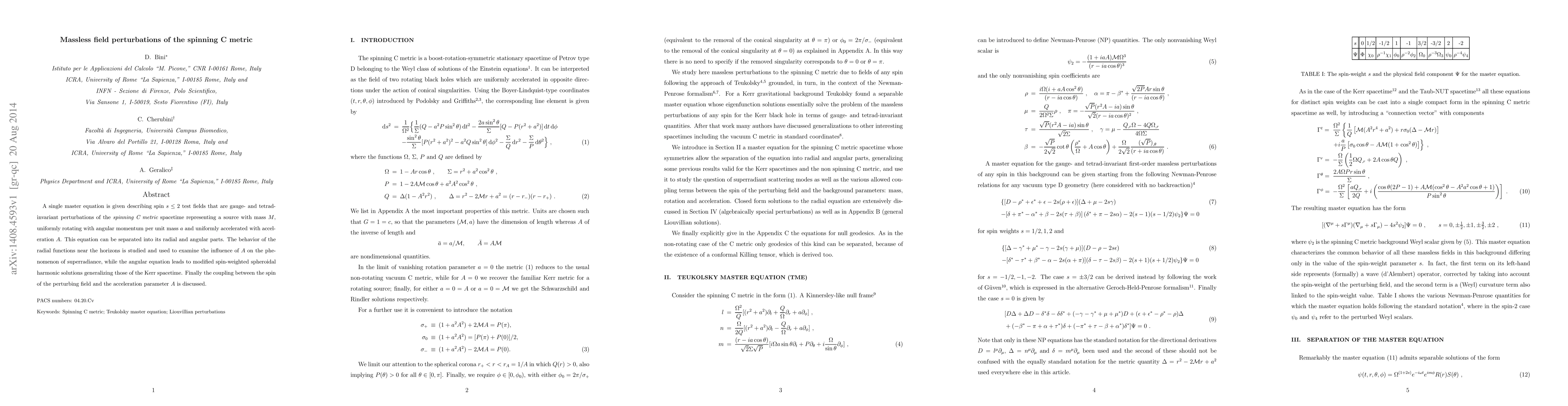 A single master equation is given describing spin $s\le2$ test fields that are gauge- and tetrad-invariant perturbations of the {\it spinning C metric} spacetime representing a source with mass $M$, uniformly rotating with angular momentum per unit mass $a$ and uniformly accelerated with acceleration $A$. This equation can be separated into its radial and angular parts. The behavior of the radial functions near the horizons is studied and used to examine the influence of $A$ on the phenomenon of superradiance, while the angular equation leads to modified spin-weighted spheroidal harmonic solutions generalizing those of the Kerr spacetime. Finally the coupling between the spin of the perturbing field and the acceleration parameter $A$ is discussed.