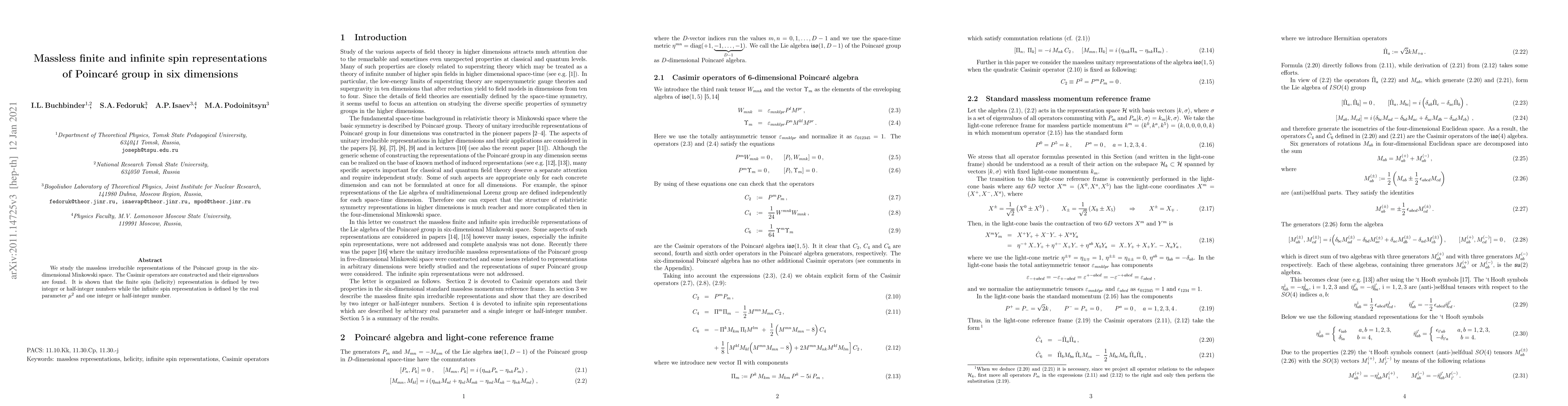 This paper explores the massless irreducible representations of the Poincaré group in six-dimensional Minkowski space, constructing the Casimir operators and determining their eigenvalues. It reveals that finite spin representations are characterized by two integer or half-integer numbers, while infinite spin representations depend on a real parameter and one integer or half-integer number.