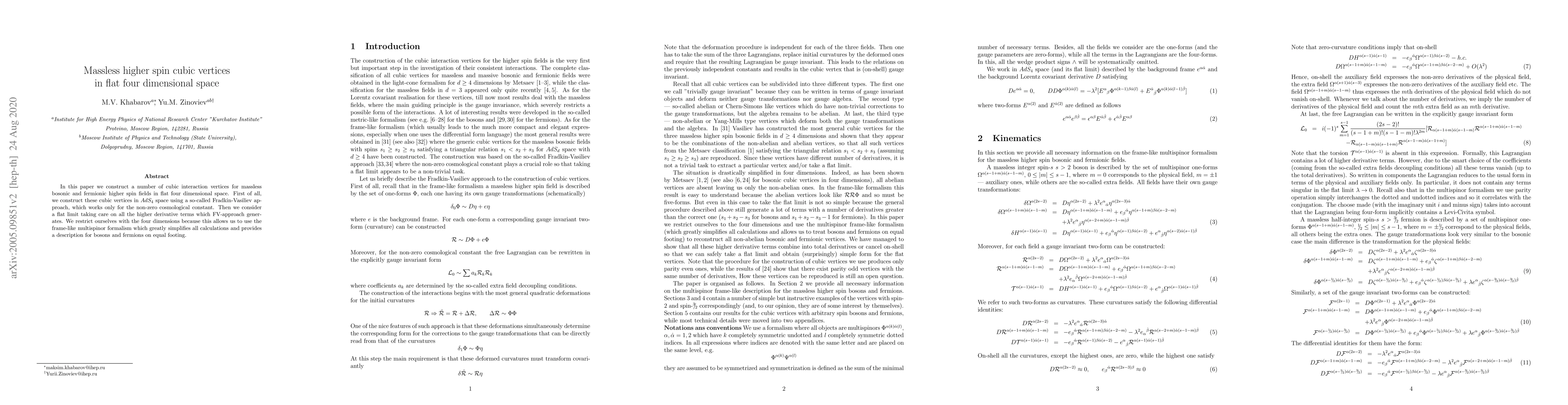 This paper constructs cubic vertices for massless higher spin fields in four-dimensional flat space, initially derived in AdS_4 using the Fradkin-Vasiliev approach, and then takes a flat limit to handle higher derivative terms. The focus on four dimensions leverages frame-like multispinor formalism for simplified calculations and unified treatment of bosons and fermions.