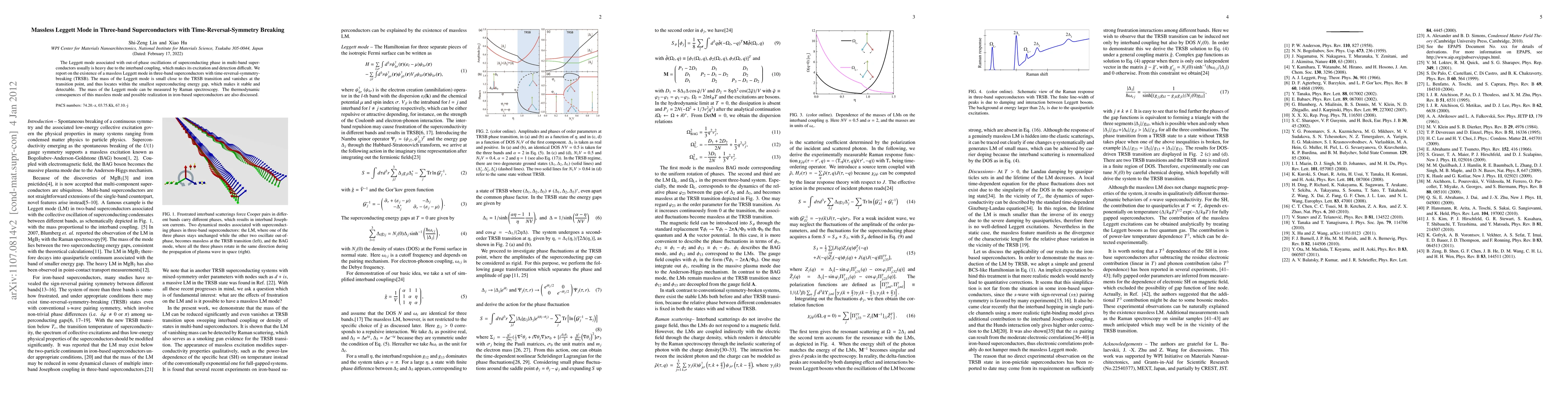This paper reports the discovery of a massless Leggett mode in three-band superconductors with time-reversal-symmetry breaking, which becomes detectable near the TRSB transition. The mode's mass vanishes at the transition point, making it stable and measurable by Raman spectroscopy, with implications for iron-based superconductors.
