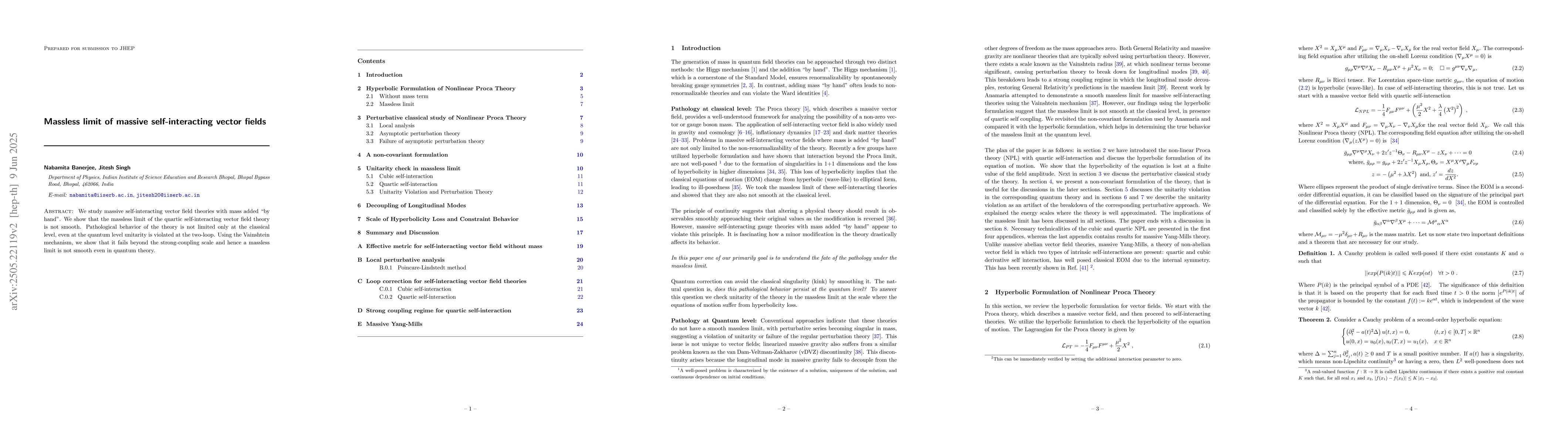 The research employs analysis of massive self-interacting vector field theories, examining the massless limit via classical and quantum level investigations, including unitarity checks at the two-loop level.