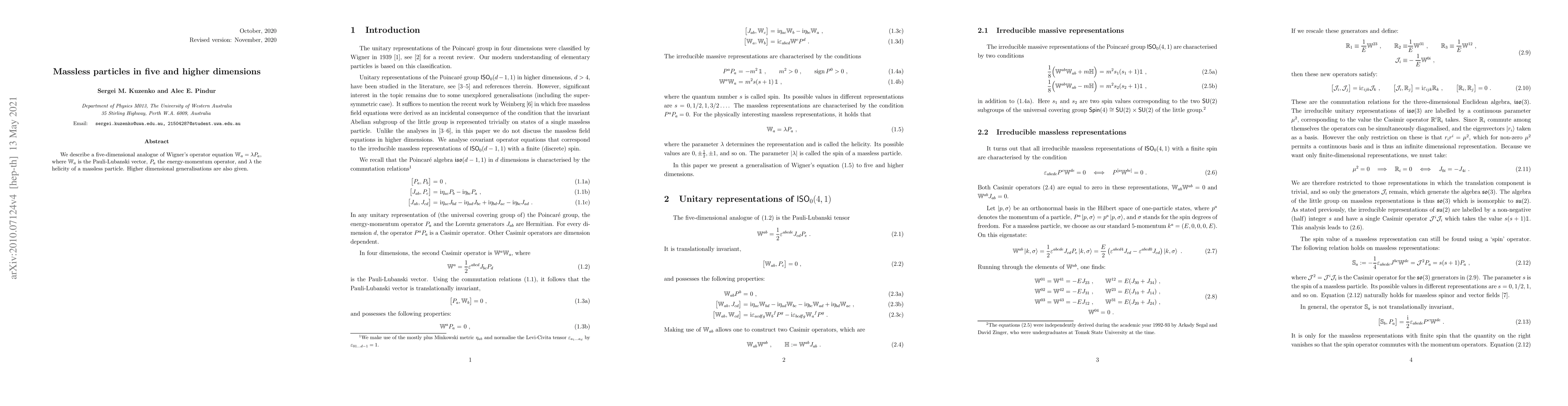 We describe a five-dimensional analogue of Wigner's operator equation ${\mathbb W}_a = \lambda P_a$, where ${\mathbb W}_a $ is the Pauli-Lubanski vector, $P_a$ the energy-momentum operator, and $\lambda$ the helicity of a massless particle. Higher dimensional generalisations are also given.